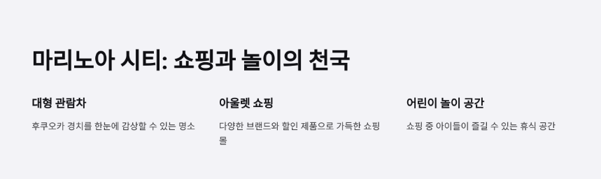마리노아 시티는 일본 최대 규모의 아울렛 몰로 쇼핑과 놀이를 동시에 즐길 수 있습니다.