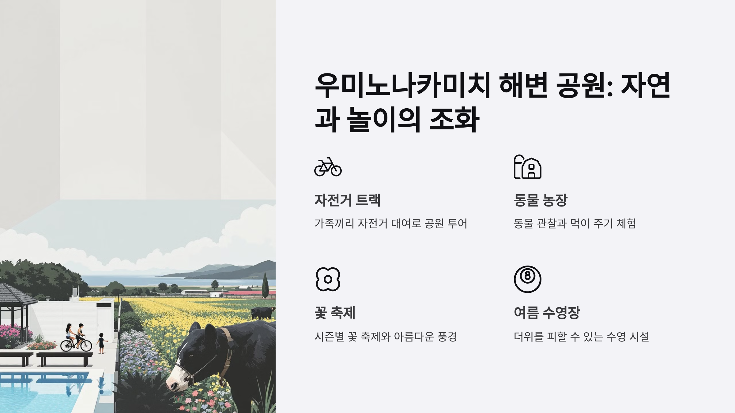 시즌별로 꽃 축제가 열리며, 아름다운 풍경이 가족 사진을 찍기에 제격입니다.