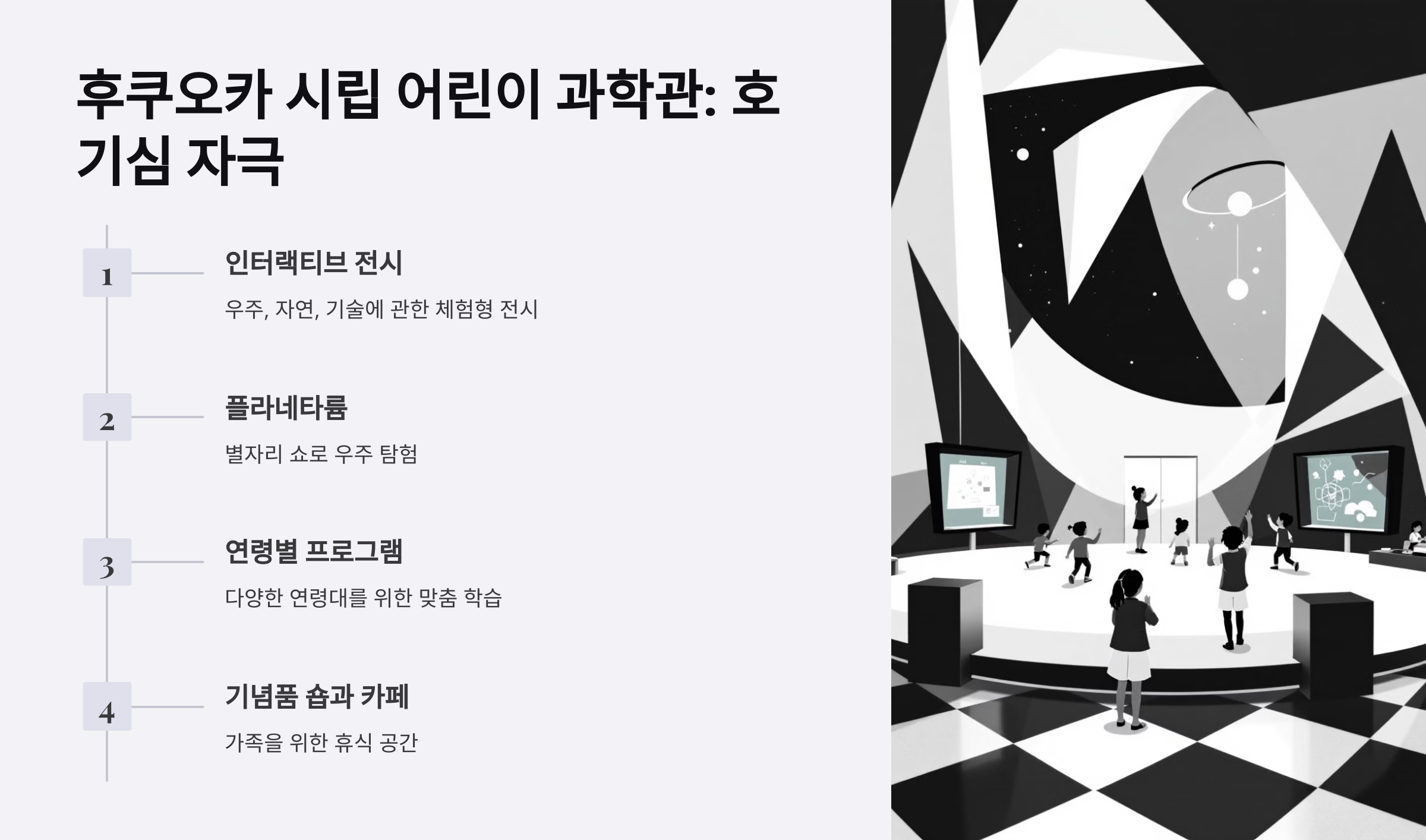 우주와 자연, 기술에 관한 흥미로운 전시를 통해 아이들이 즐겁게 학습할 수 있습니다.