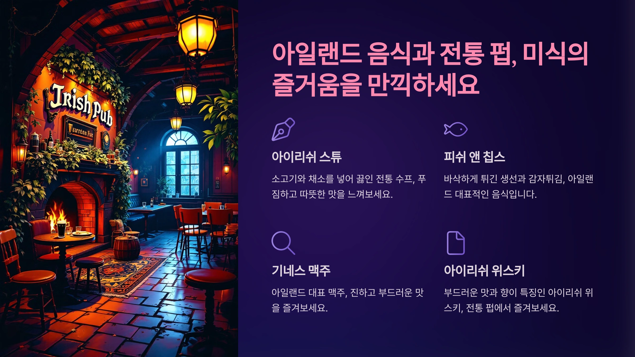 아일랜드 펍은 단순히 술을 마시는 장소가 아니라, 현지 문화를 체험할 수 있는 공간이에요. 전통적인 펍에서는 생생한 라이브 음악 공연과 함께 따뜻한 분위기를 느낄 수 있어요. 기네스 맥주나 아일랜드 위스키를 시켜 현지인들과 이야기를 나누며 특별한 시간을 보내보세요.