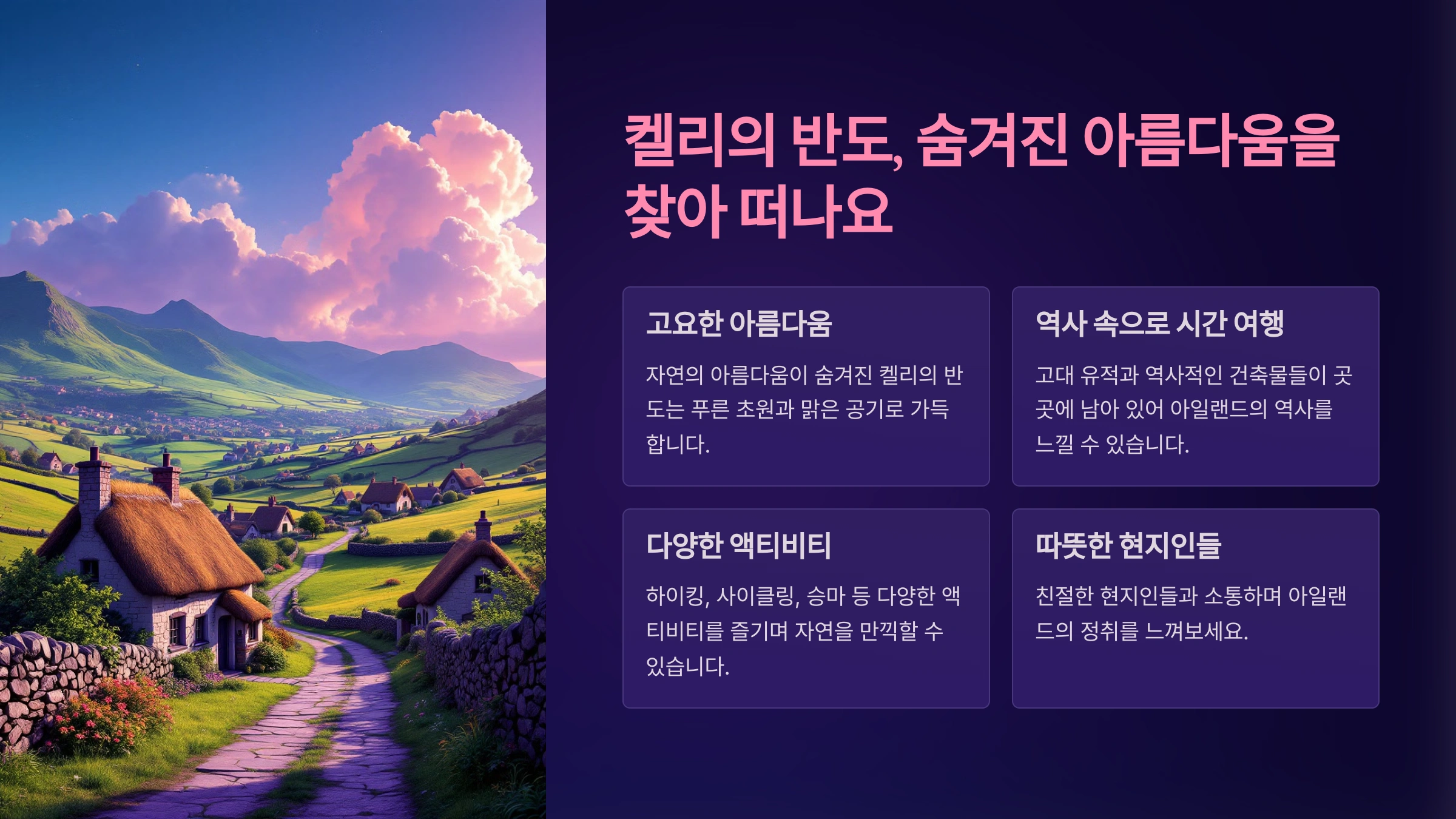 켈리의 반도(Ring of Kerry)는 아일랜드 남서부에 위치한 아름다운 드라이브 코스예요. 이곳은 드넓은 초원, 해안선, 그리고 산악 풍경이 어우러져 여행자들에게 잊지 못할 경험을 선사한답니다. 약 179km에 이르는 순환 도로는 도보, 자전거, 자동차 등 다양한 방법으로 탐험할 수 있어요.