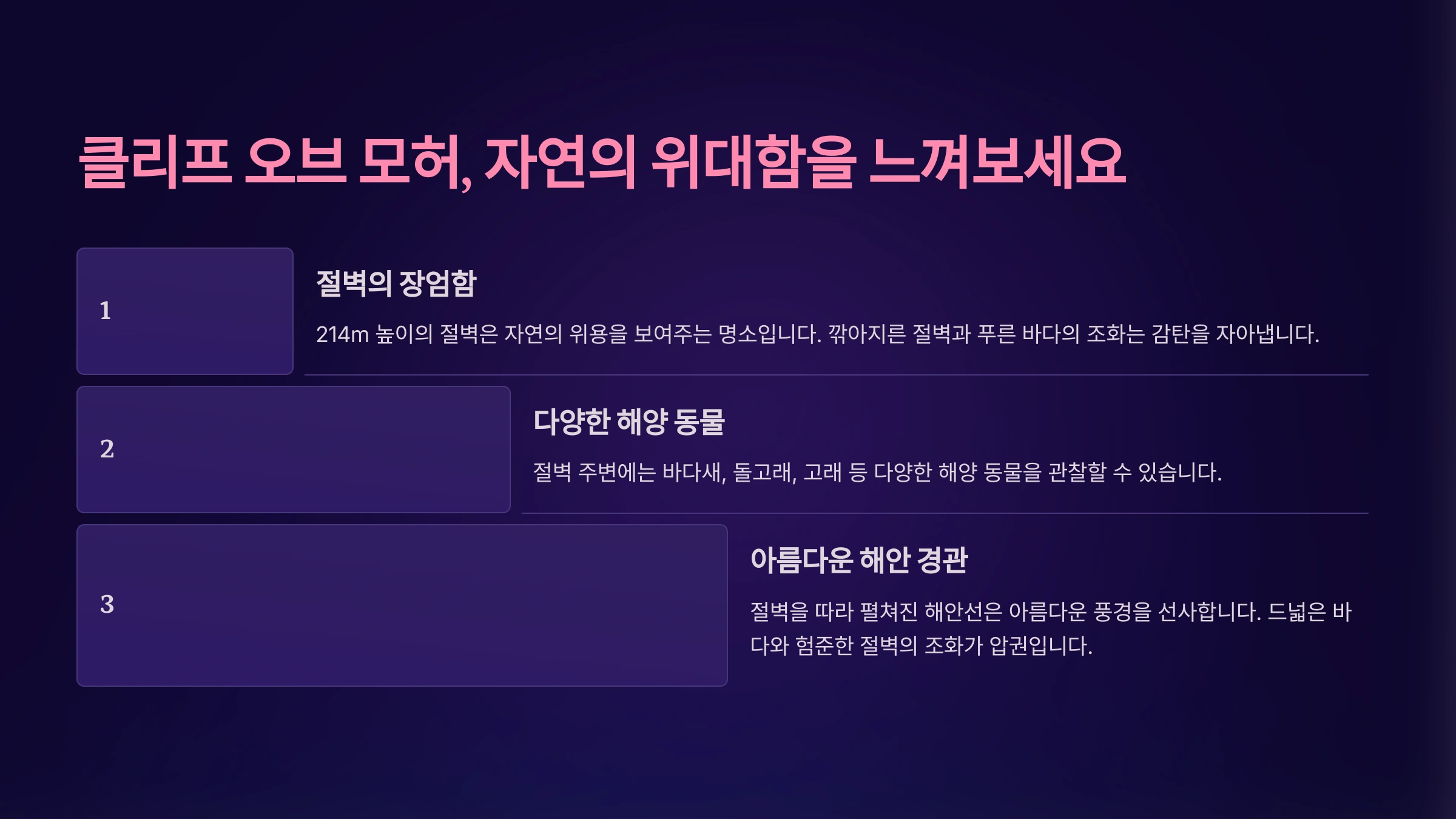 특히 해질녘에 방문하면 절벽 위로 붉은 노을이 드리워져 정말 환상적인 장면을 감상할 수 있어요. 해안선을 따라 걷다 보면 바람소리와 파도 소리가 어우러져, 이곳의 자연이 얼마나 거대하고 아름다운지 직접 느낄 수 있답니다.
