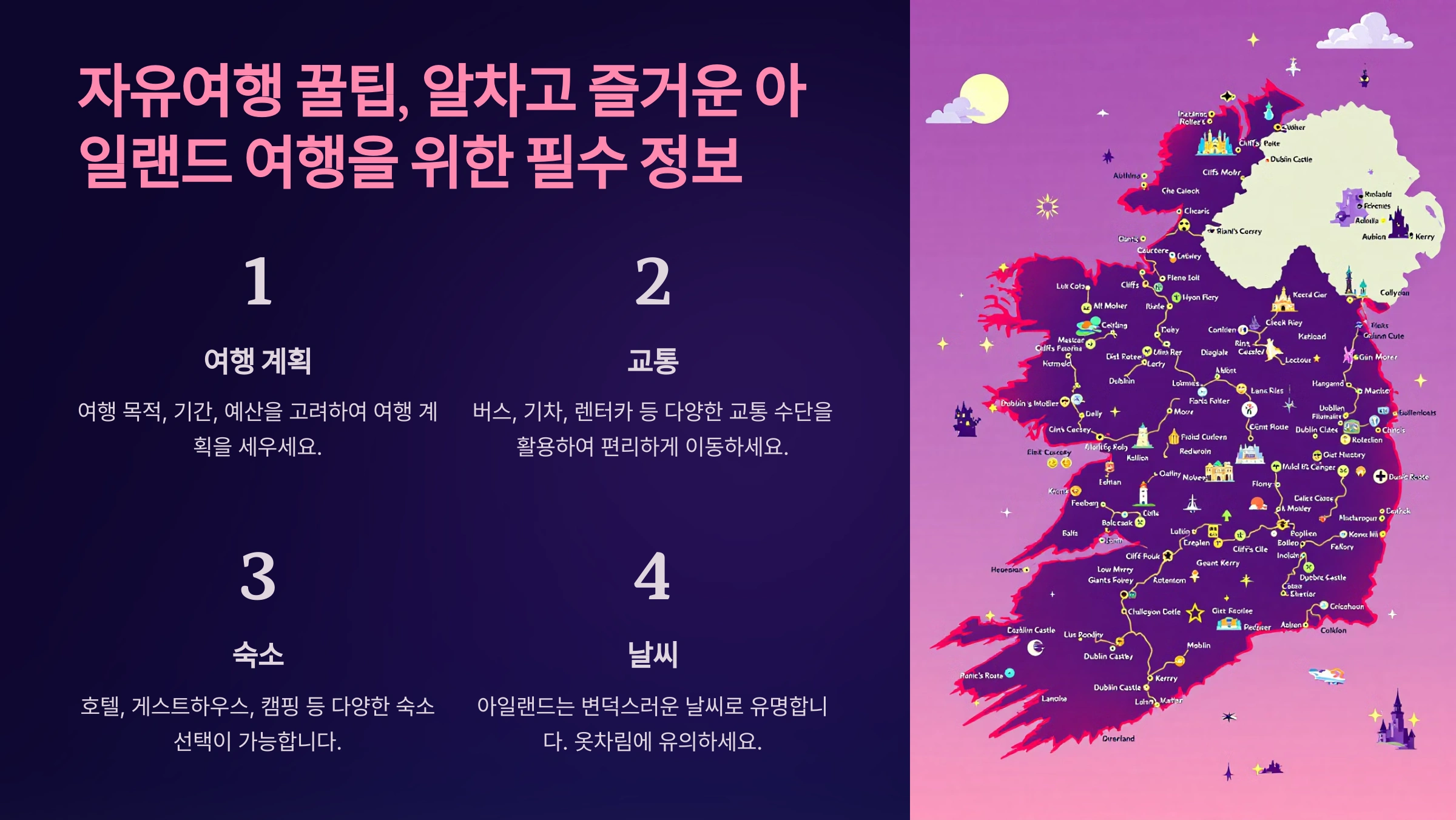 여행 준비물로는 편안한 신발, 두꺼운 옷, 그리고 카메라를 추천해요. 특히 클리프 오브 모허와 같은 자연경관을 방문할 예정이라면 튼튼한 등산화가 큰 도움이 될 거예요. 아일랜드의 각 도시를 이동하려면 기차와 버스가 주요 교통수단이지만, 자동차를 렌트해도 좋답니다.