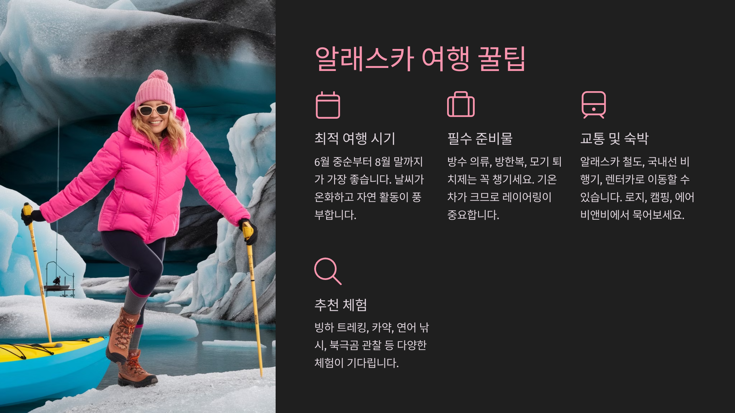 하지만 알라스카는 광활한 면적과 험난한 기후 조건으로 인해 철저한 준비가 필요합니다. 언제 방문하는지에 따라 즐길 수 있는 액티비티가 달라지고, 교통수단과 숙박 예약도 미리 고려해야 합니다. 특히, 알라스카는 다른 미국 도시들과 달리 대중교통이 발달하지 않아 렌터카나 투어 패키지를 이용하는 것이 일반적입니다.