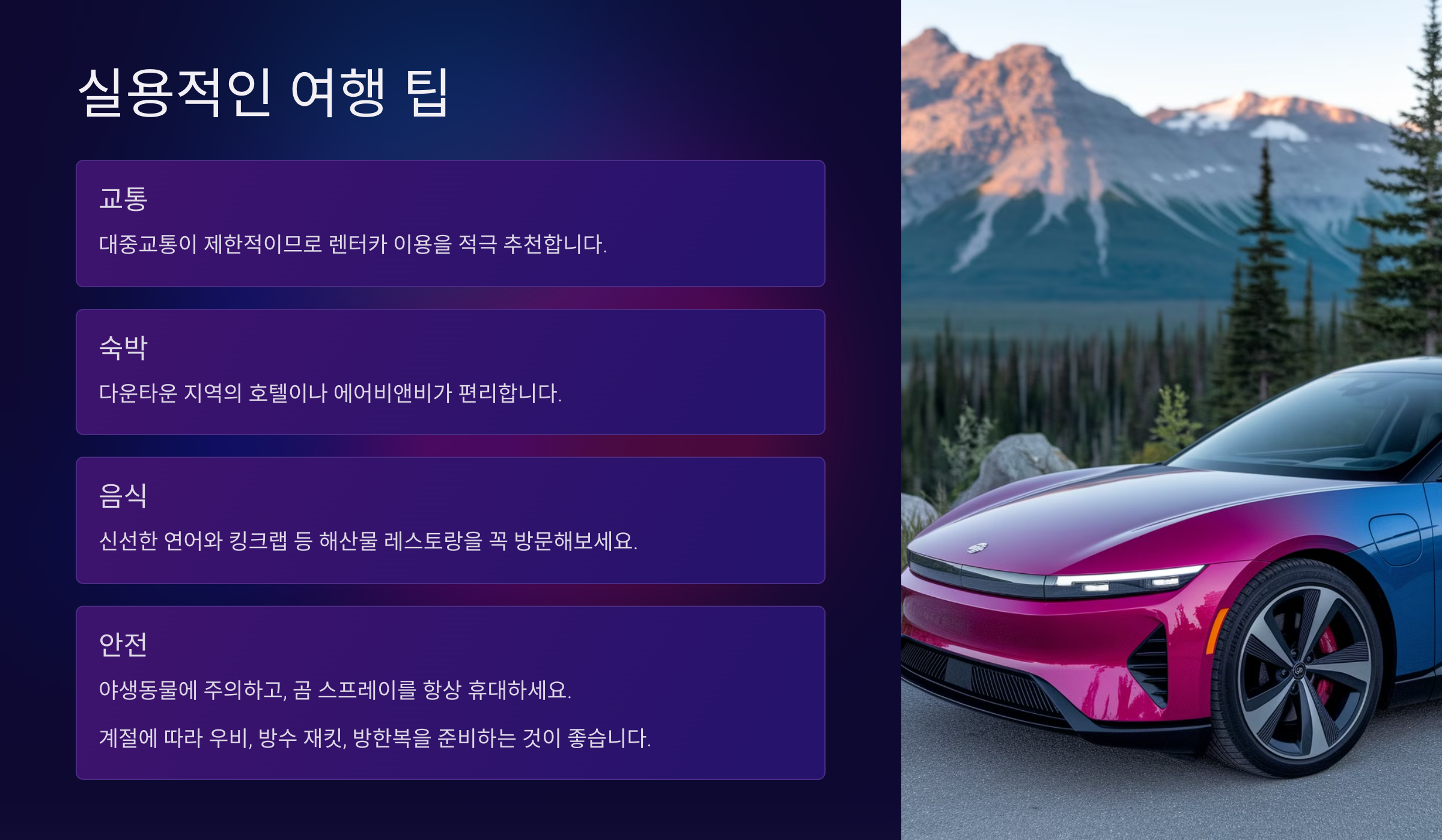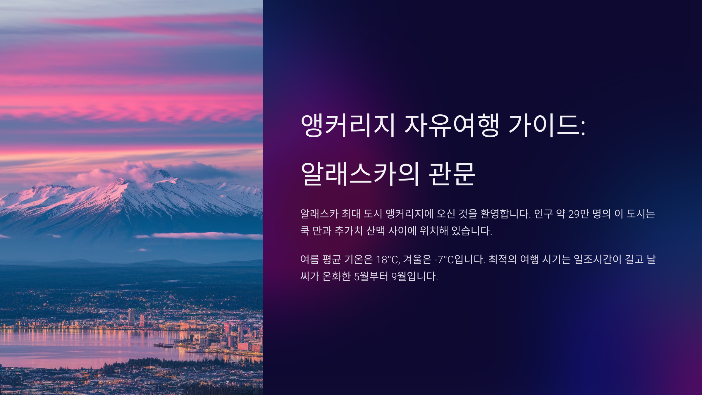 오늘은 앵커리지를 100% 즐길 수 있는 최적의 여행 일정, 추천 명소, 맛집, 숙소, 교통수단 등을 상세히 소개합니다.