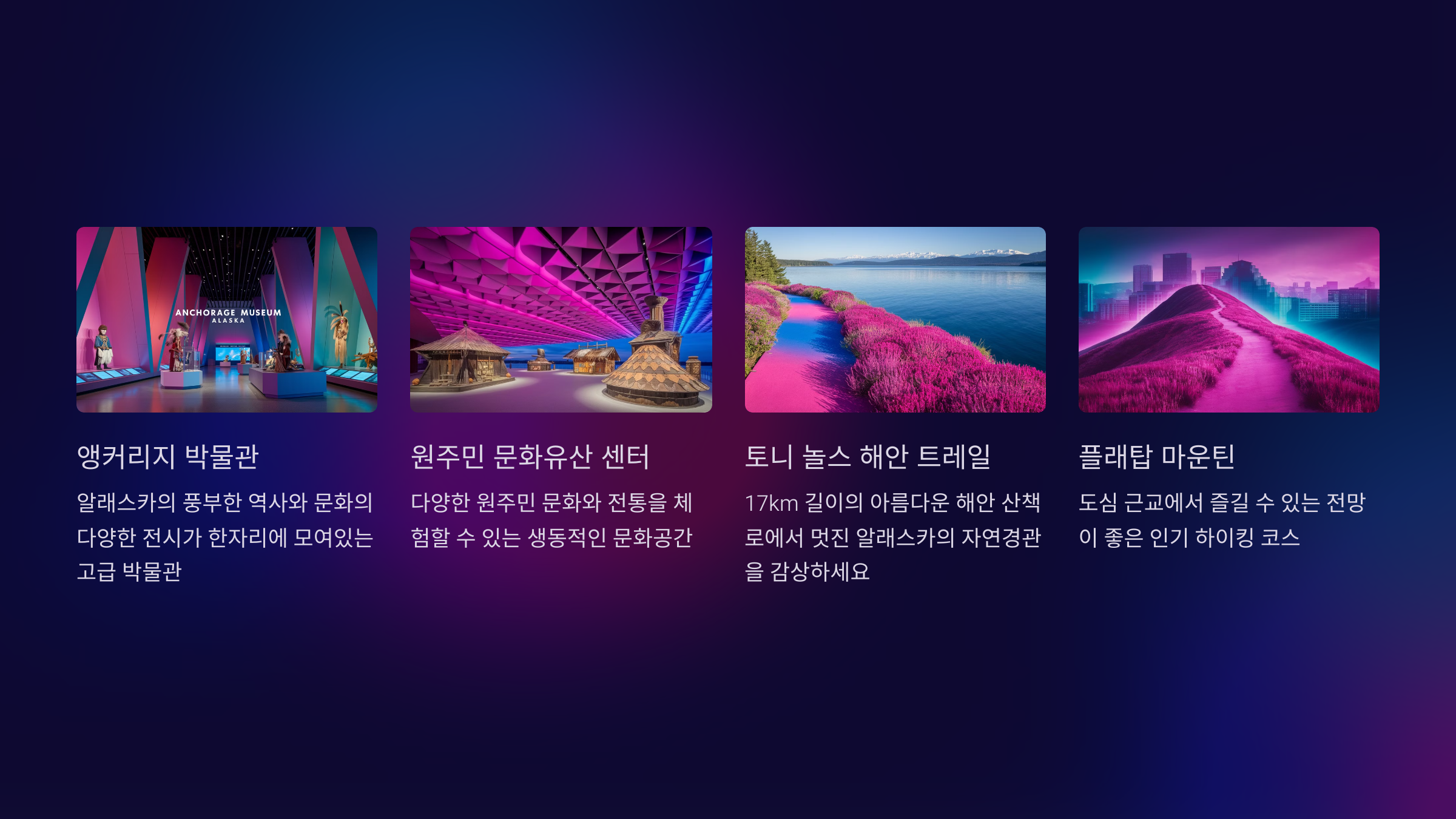 앵커리지를 방문한다면 절대 놓쳐서는 안 될 주요 명소들을 소개합니다.