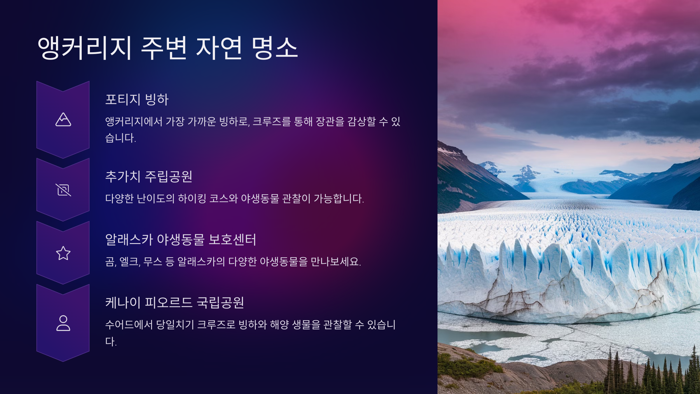 빙하와 바다, 야생동물이 어우러진 절경을 감상할 수 있는 곳으로, 크루즈 투어가 인기 있습니다.