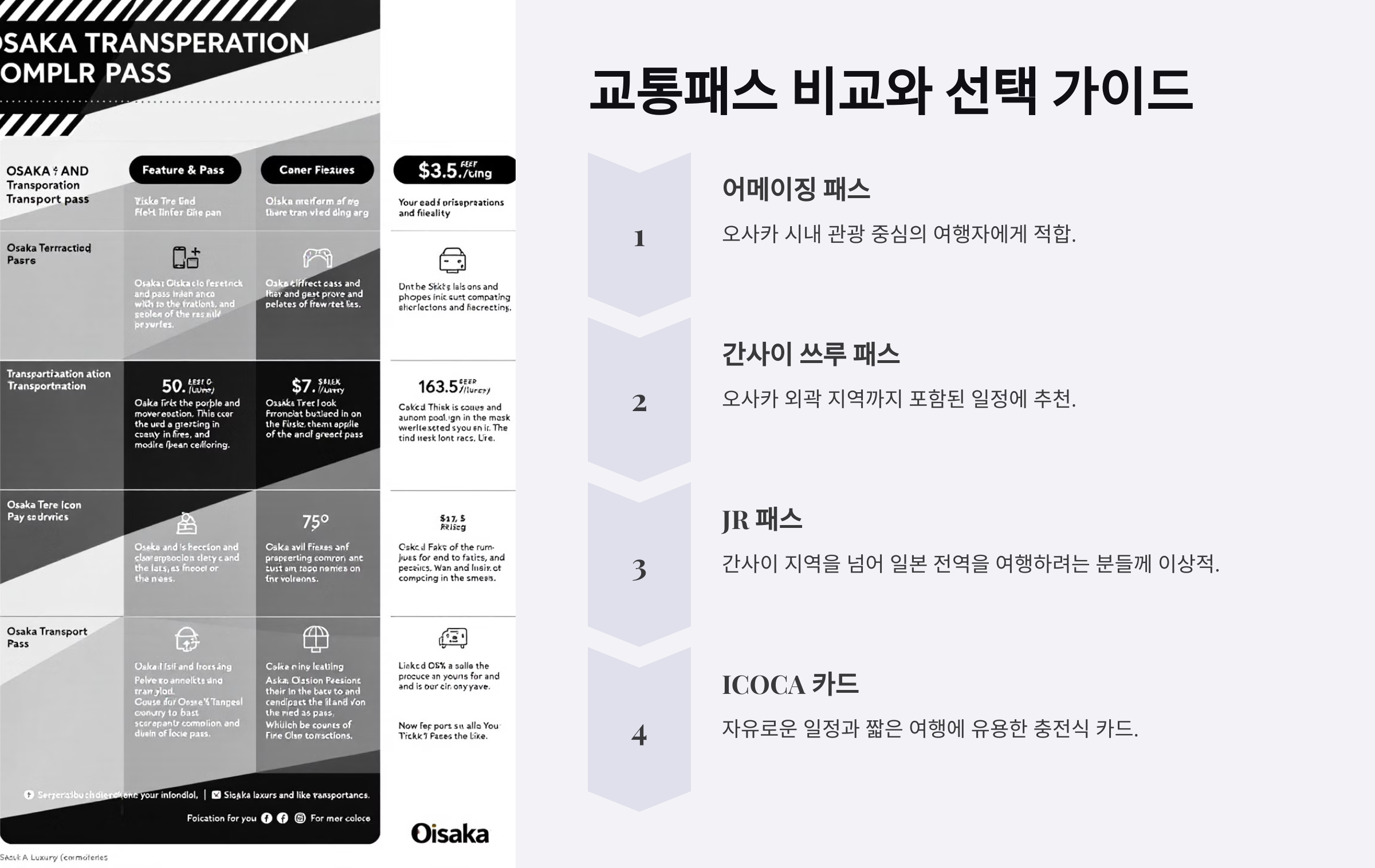 오사카를 포함한 간사이 지역의 교통패스는 매우 다양합니다. 각 패스는 여행 목적, 기간, 방문할 장소에 따라 선택할 수 있습니다.