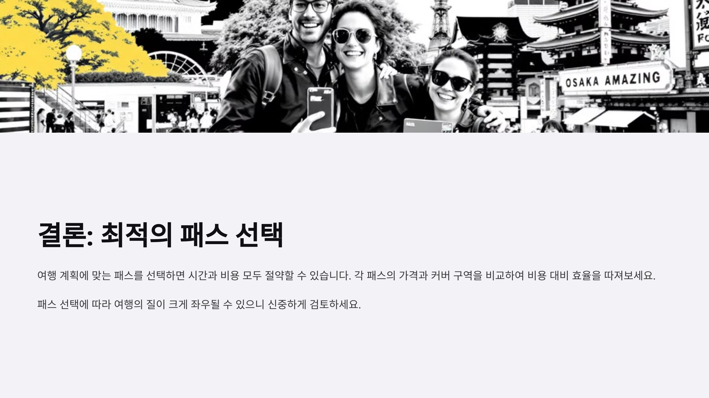 여행 목적과 일정에 따라 패스를 선택하세요. 관광지가 많다면 어메이징 패스, 장거리 이동이 많다면 간사이 쓰루 패스를 추천합니다.