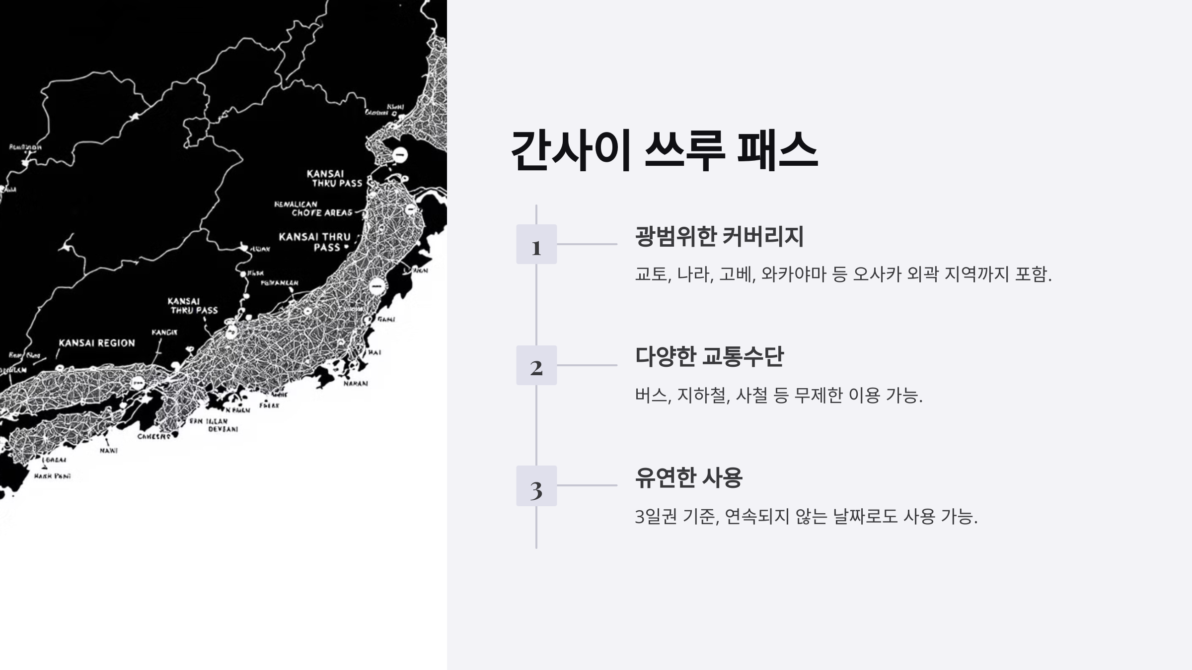 교토, 나라, 고베, 와카야마 등 오사카 외곽 지역까지 커버하여 장거리 이동에 유리합니다.