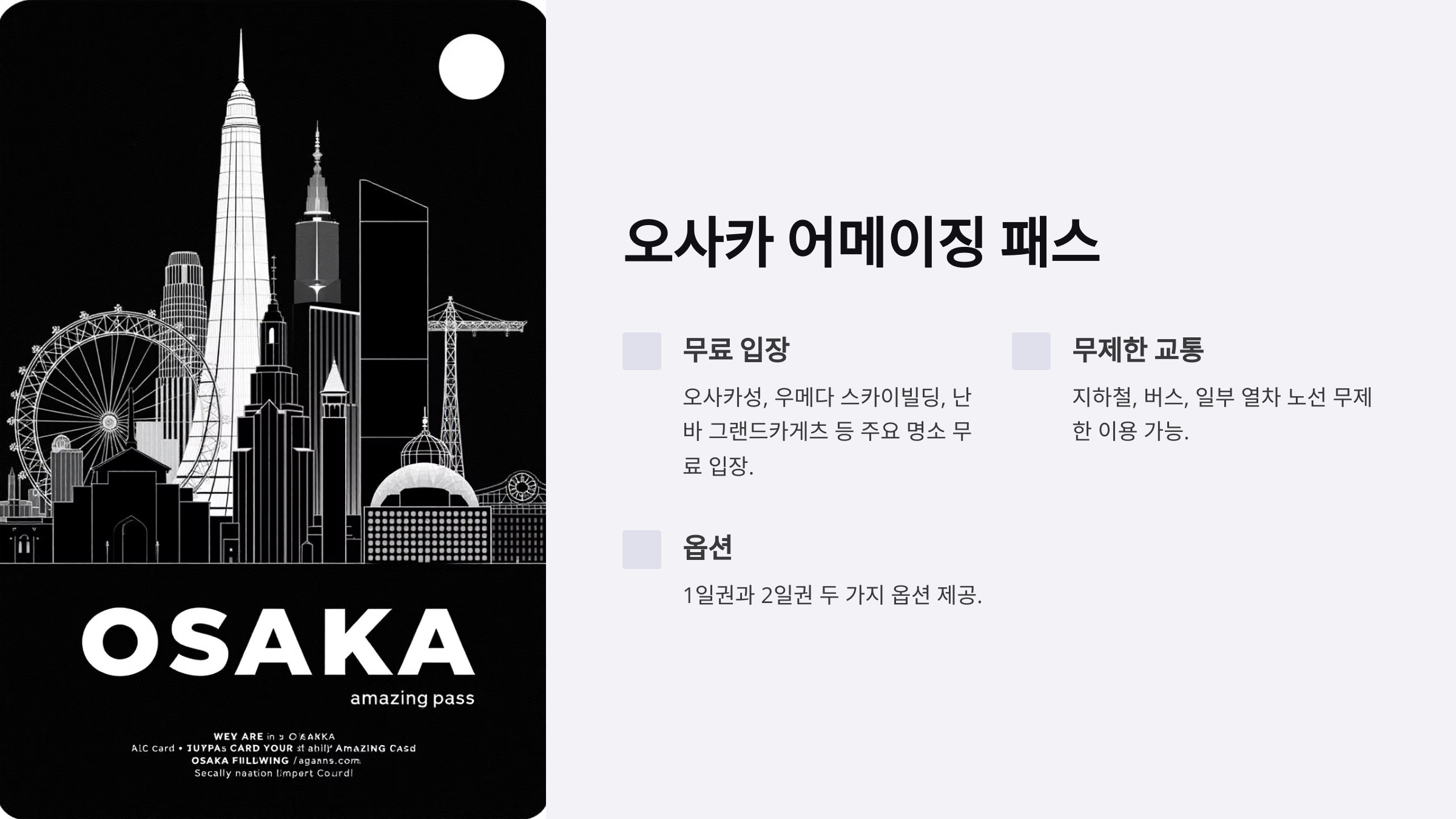 오사카 어메이징 패스는 관광지 무료 입장과 무제한 교통 이용을 결합한 대표적인 패스입니다.