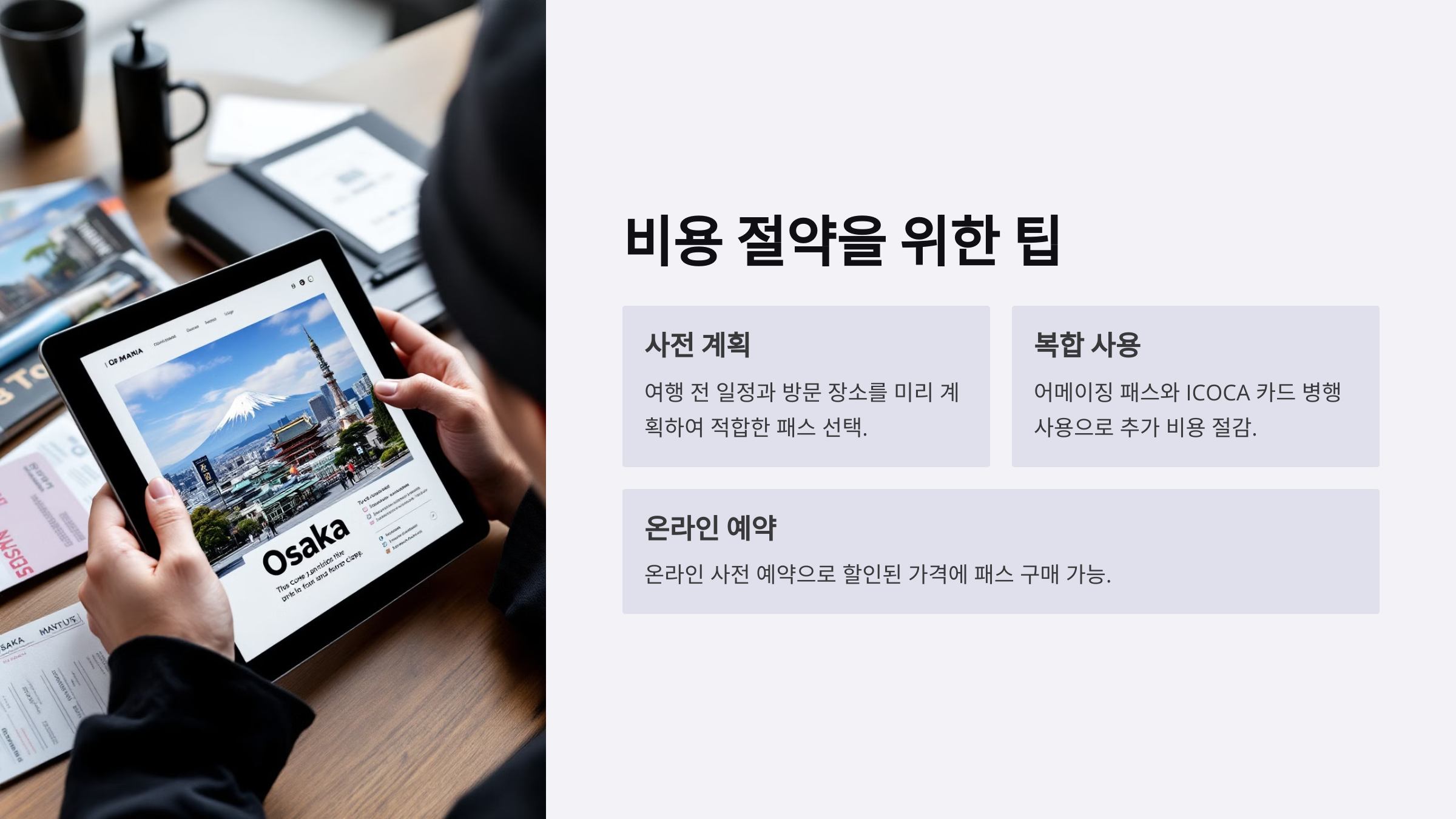 오사카 여행에서 비용을 절약하려면 교통패스를 효과적으로 활용해야 합니다.