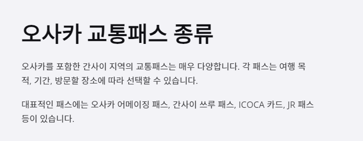 오사카를 포함한 간사이 지역의 교통패스는 매우 다양합니다. 각 패스는 여행 목적, 기간, 방문할 장소에 따라 선택할 수 있습니다.