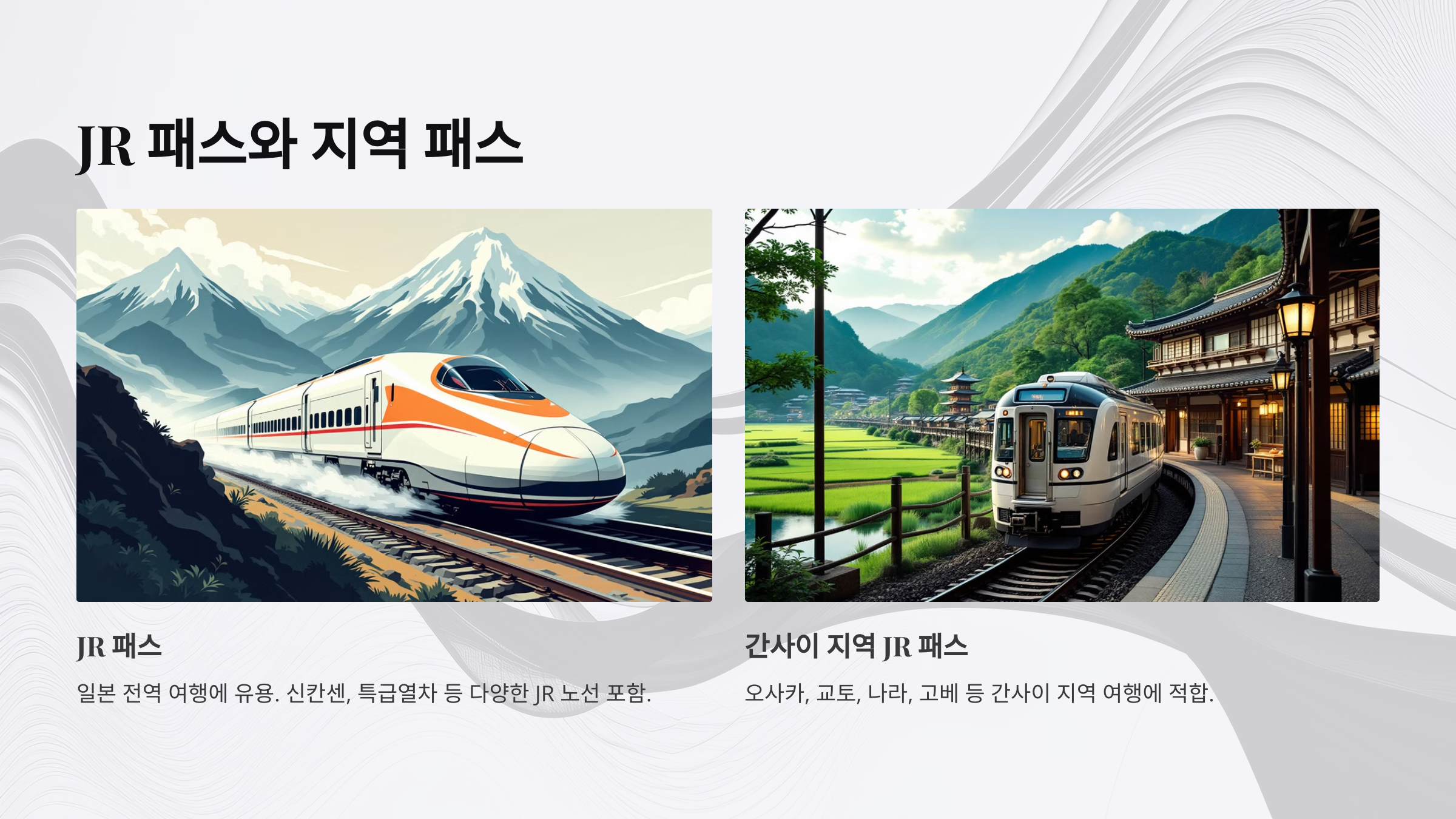 JR 패스는 신칸센, 특급열차 등 다양한 JR 노선을 포함하여 넓은 이동 범위를 제공합니다.