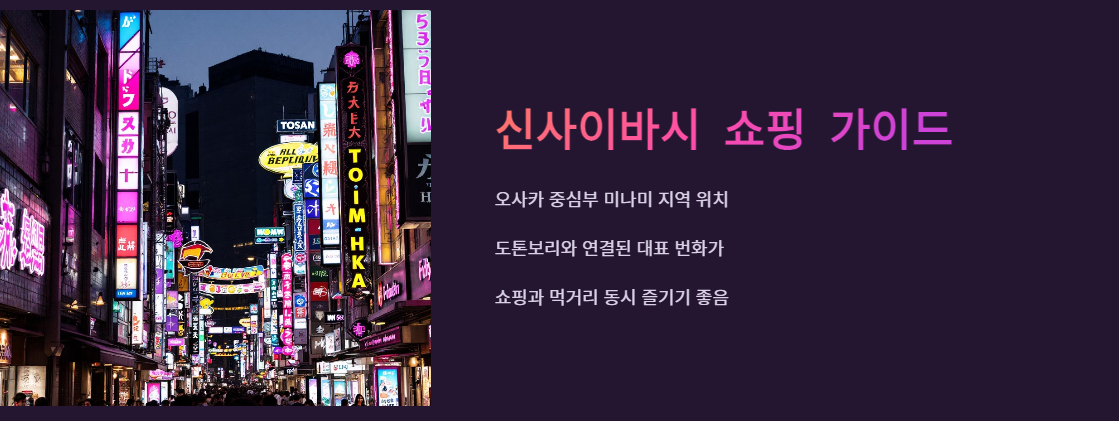 신사이바시는 대중교통으로 접근성이 뛰어나고, 주요 관광지와도 가까워 오사카 여행 중 하루 정도는 이곳에서 쇼핑과 식사를 즐기는 것이 좋습니다.
