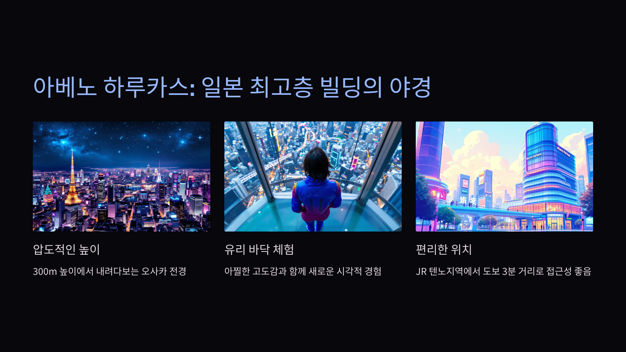일본에서 가장 높은 빌딩인 아베노 하루카스의 전망대는 오사카의 스카이라인을 한눈에 조망할 수 있는 곳입니다. 300m 높이에서 바라보는 야경은 스케일이 남다르며, 특히 고급스러운 실내 디자인이 더해져 특별한 분위기를 연출합니다.