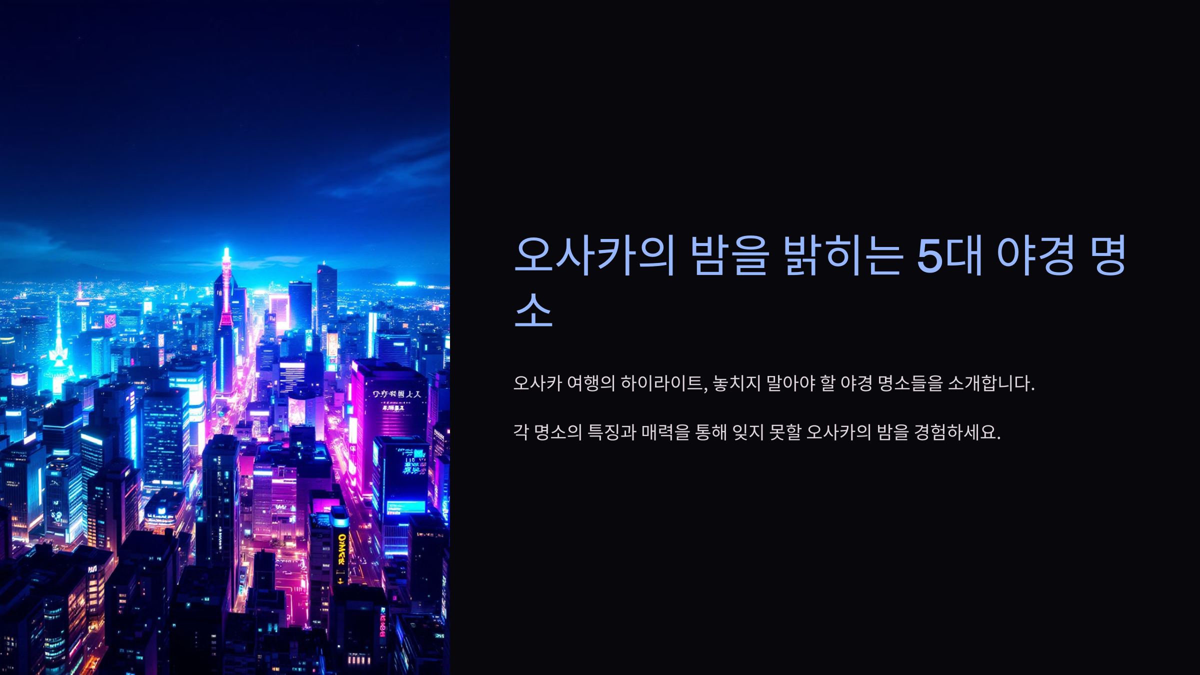 오사카는 일본에서 손꼽히는 대도시로, 낮에도 활기차지만 밤이 되면 도시 곳곳에 아름다운 야경이 펼쳐지는 곳으로 유명합니다. 빛나는 네온사인과 현대적 건축물, 그리고 자연이 어우러진 오사카의 야경은 감탄을 자아냅니다.