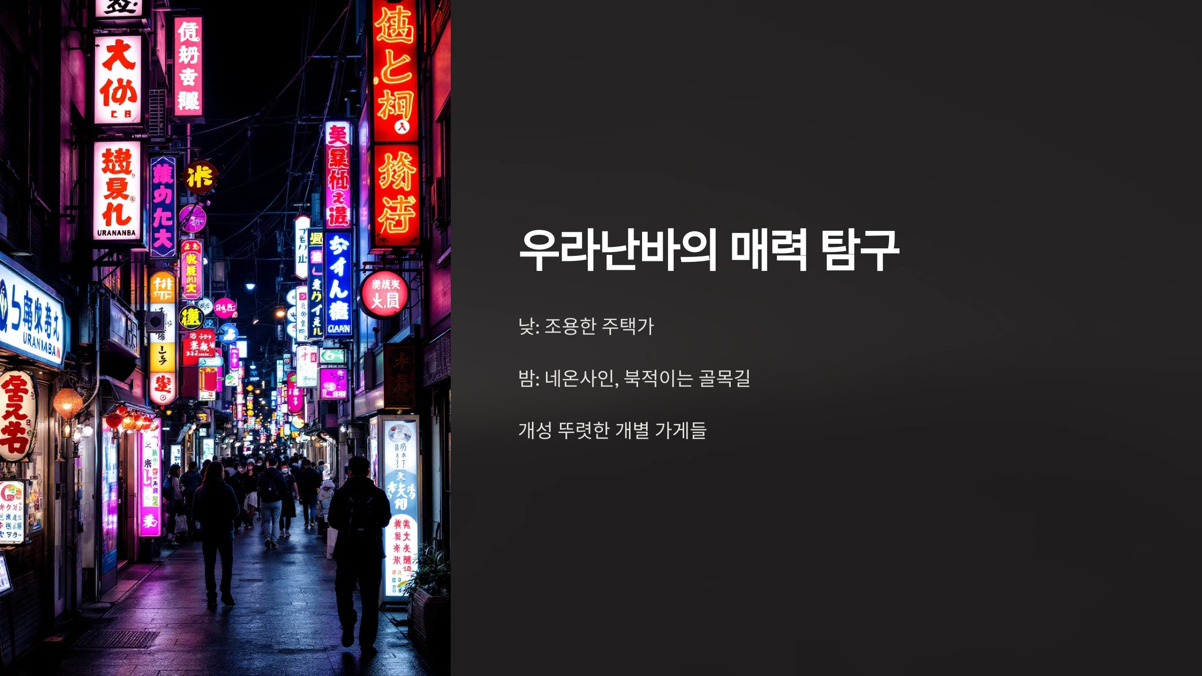 우라난바는 낮과 밤이 전혀 다른 분위기를 가진 동네입니다. 낮에는 조용한 주택가 느낌이 강하지만, 해가 지고 나면 좁은 골목길이 환한 네온사인과 사람들로 북적이죠. 이곳은 난바의 대형 쇼핑몰이나 프랜차이즈 맛집이 아니라, 개성이 뚜렷한 개별 가게들이 많아서 더욱 특별합니다.