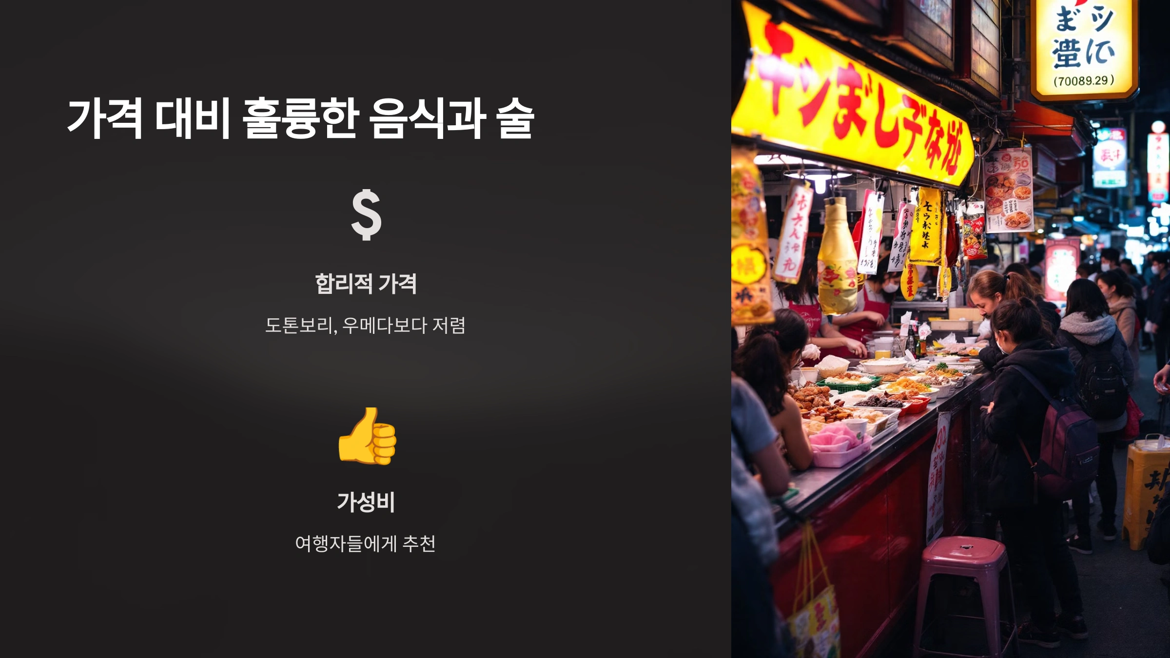 우라난바의 또 다른 매력은 합리적인 가격대입니다. 도톤보리나 우메다처럼 관광객이 몰리는 지역보다 가격이 상대적으로 저렴한 편이라 가성비 좋은 곳을 찾는 여행자들에게 추천할 만합니다.