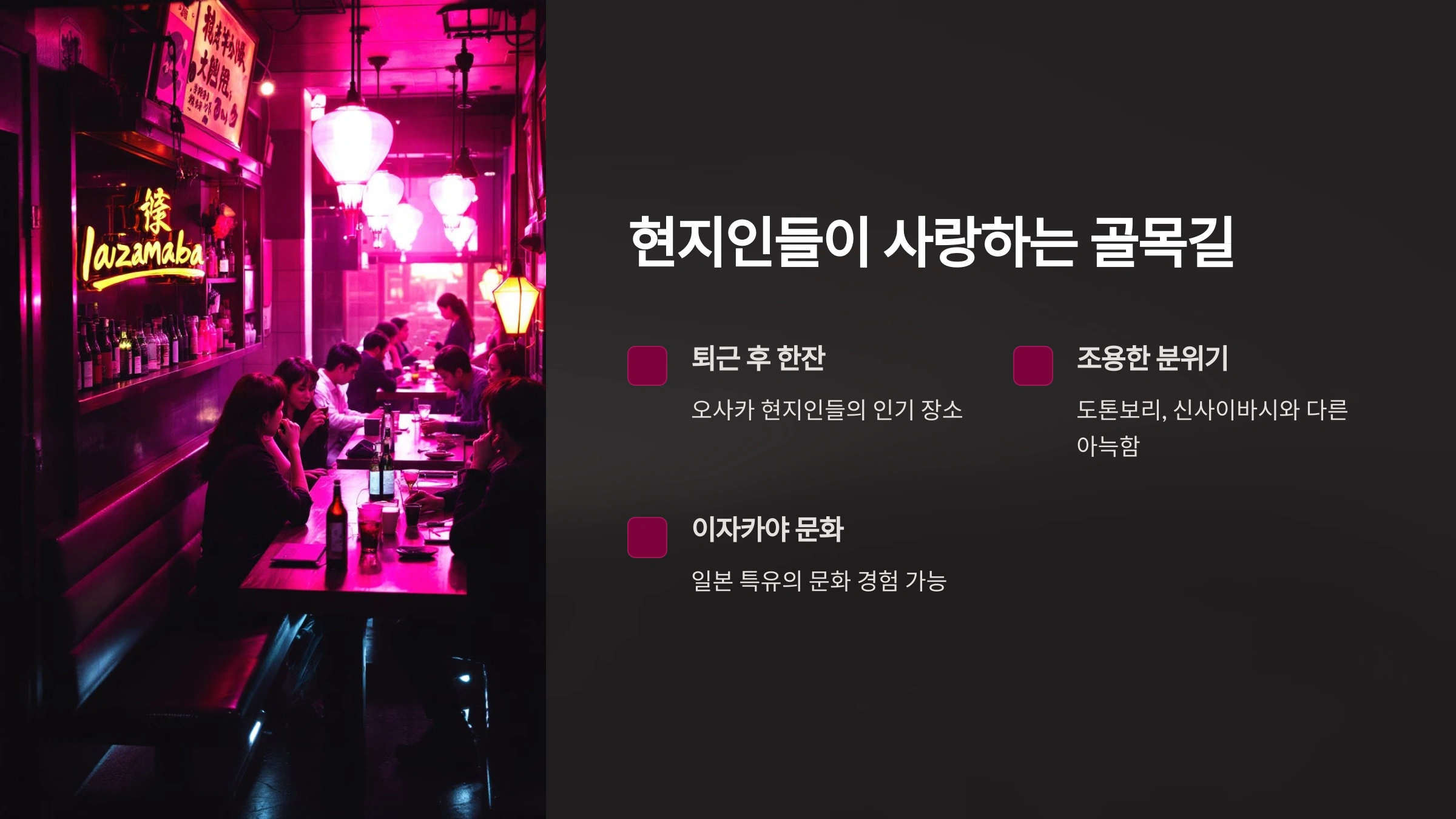이곳은 유명한 도톤보리 거리나 신사이바시의 화려한 분위기와는 달리, 조금 더 로컬스러운 분위기를 느낄 수 있어요. 좁은 골목길을 따라 개성 넘치는 이자카야와 바, 일본 가정식 요리를 즐길 수 있는 작은 가게들이 가득합니다.