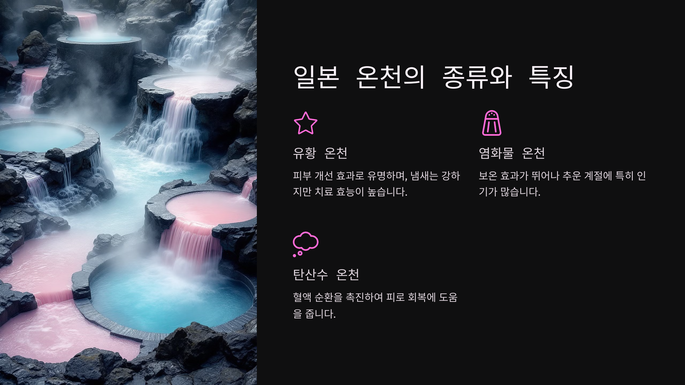 일본의 온천은 물의 성분에 따라 다양한 종류로 나뉩니다.