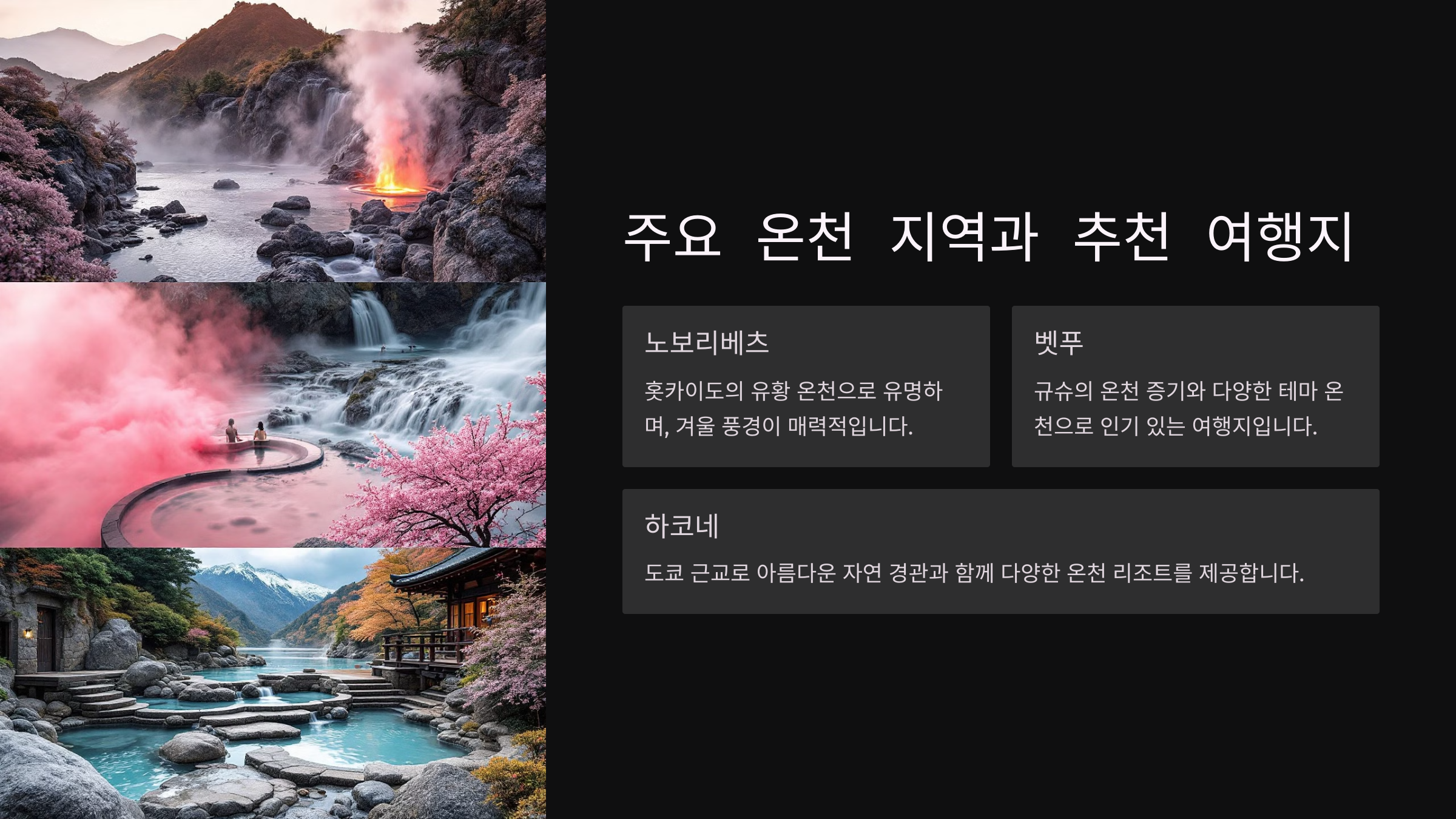 일본에는 다양한 온천 지역이 있으며, 각각 독특한 매력을 가지고 있습니다.