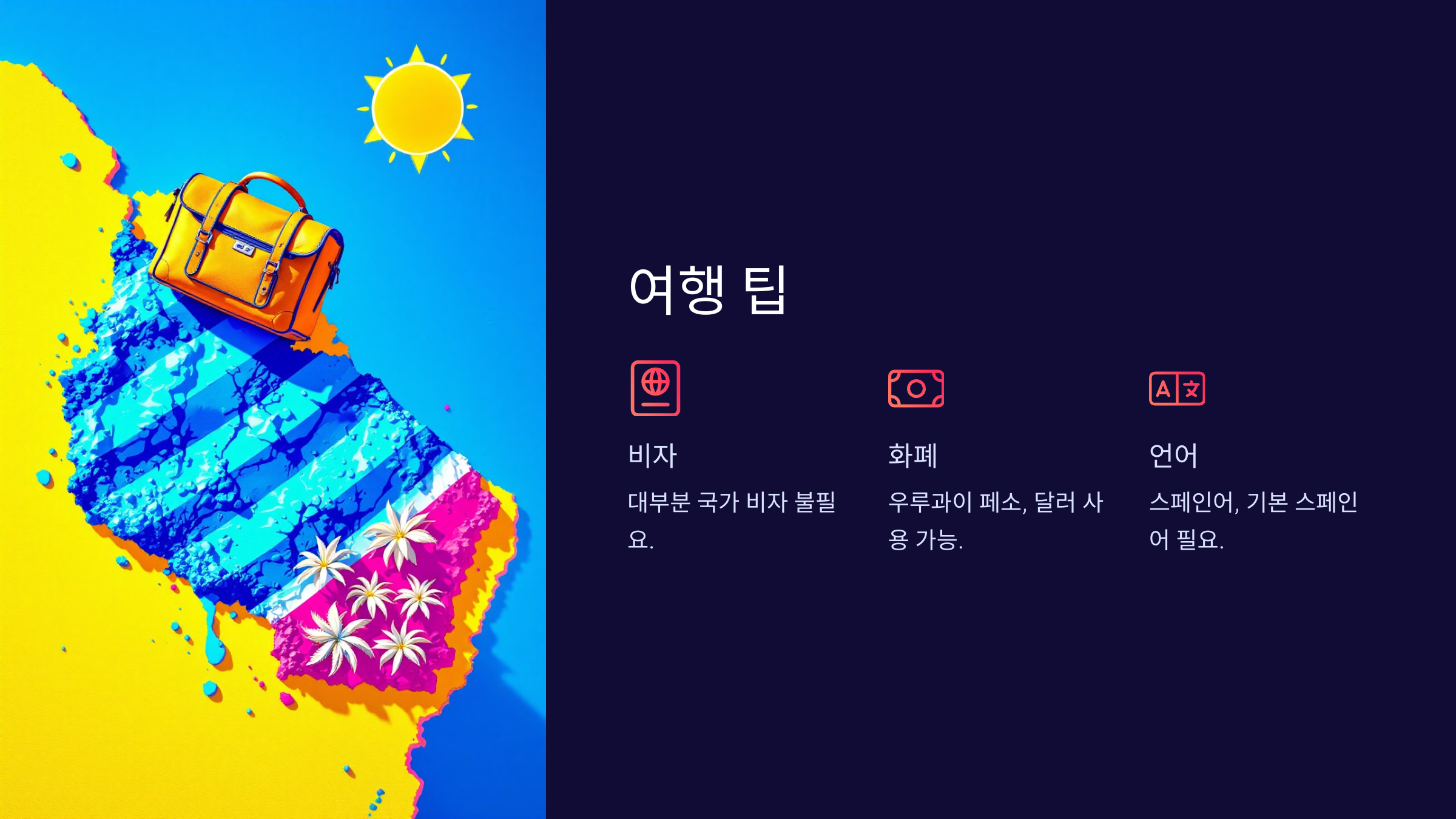남미에 위치한 우루과이는 작은 나라지만 아름다운 자연, 풍부한 문화유산, 그리고 현대적인 도시 매력을 동시에 가진 여행지입니다. 아르헨티나와 브라질 사이에 위치하며 대서양과 맞닿아 있는 이 나라는 깨끗한 해변, 멋진 콜로니얼 건축물, 그리고 우루과이 특유의 여유로운 분위기로 유명합니다.