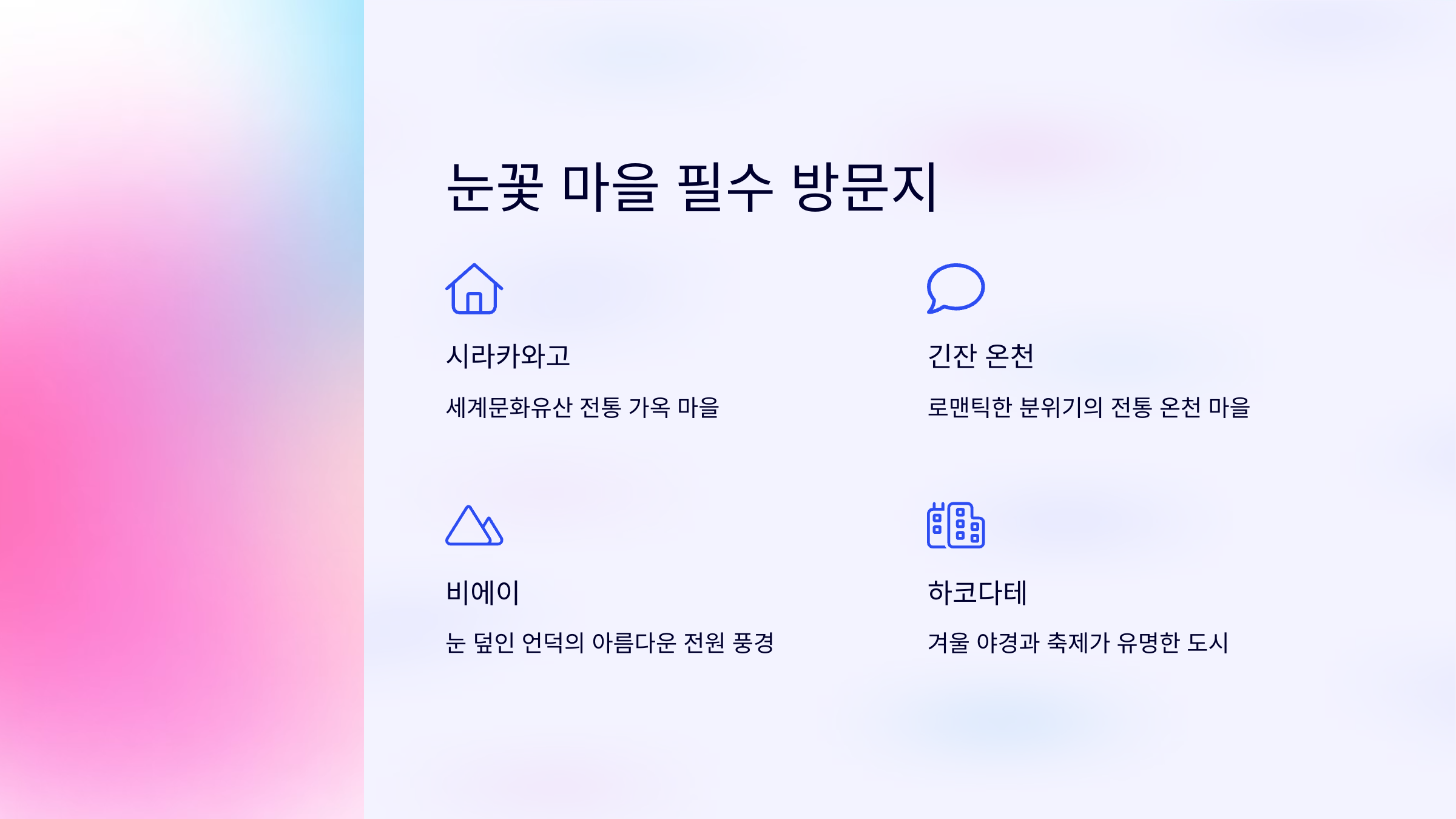 1. 시라카와고: 세계문화유산에 등록된 전통 가옥 마을로, 겨울철 환상적인 설경을 자랑합니다.