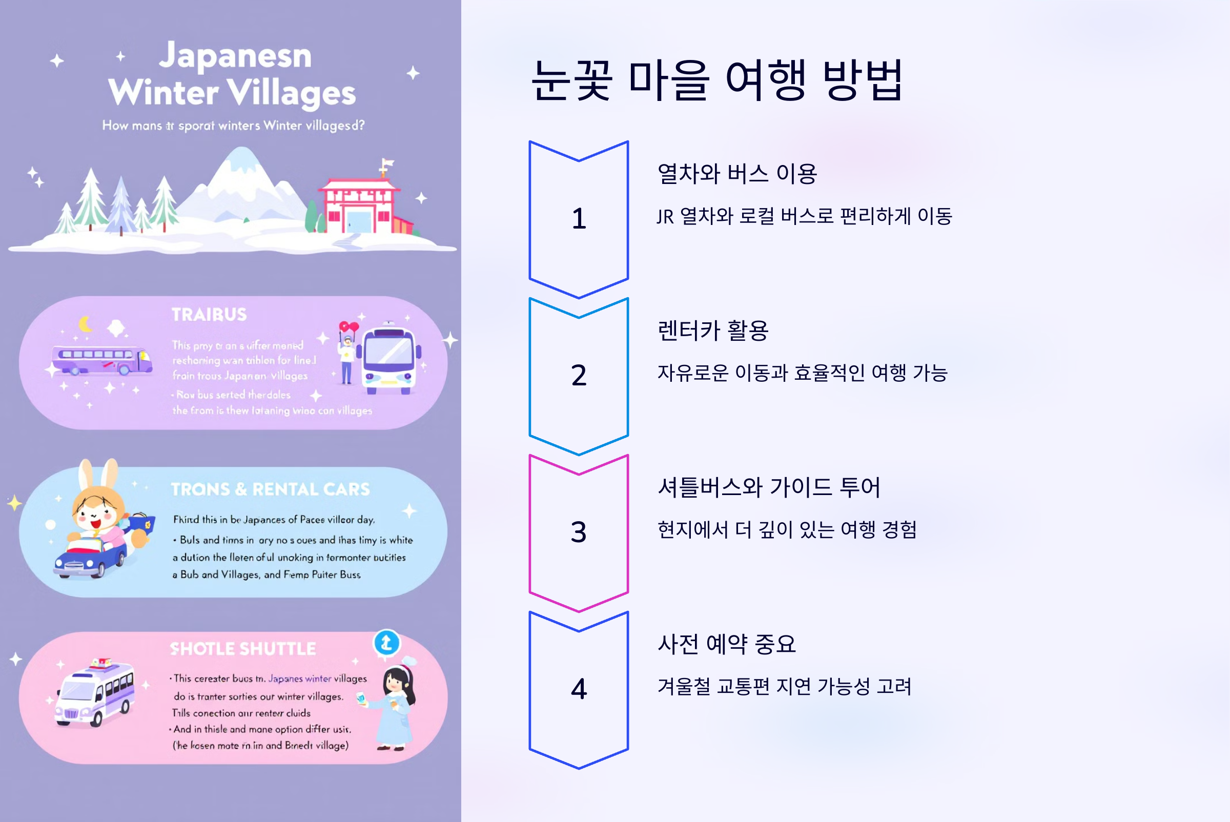 교통편 예약은 미리 해두는 것이 좋습니다. 특히 인기 있는 눈꽃 마을은 성수기에는 매우 혼잡합니다.