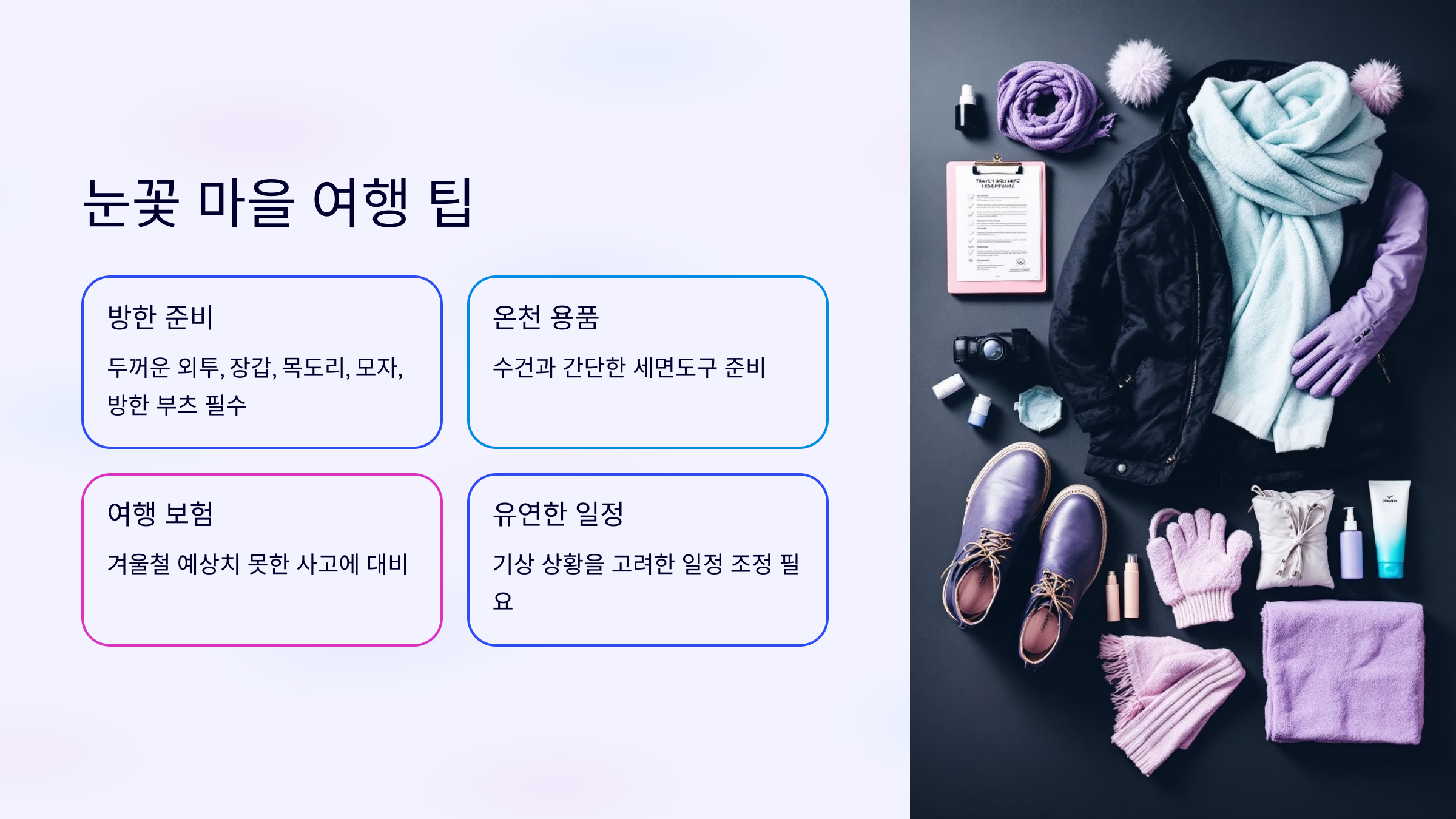 눈꽃 마을 여행을 위해 적절한 준비를 하면 더욱 편리하고 즐거운 여행을 할 수 있습니다. 방한용품 준비가 필수적입니다.