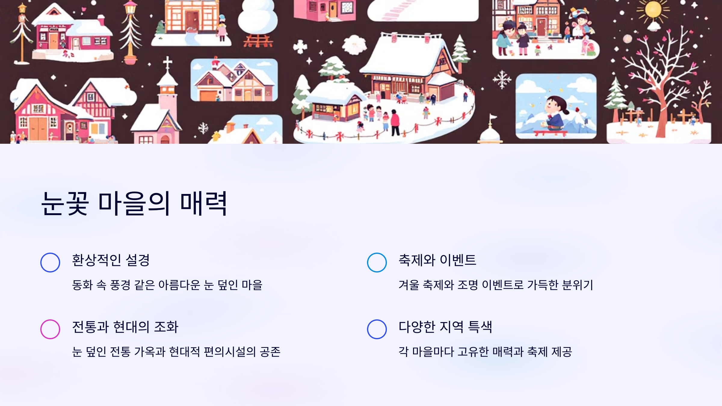 다양한 지역의 눈꽃 마을마다 고유한 매력과 축제가 열려 여행의 폭을 넓힐 수 있습니다.