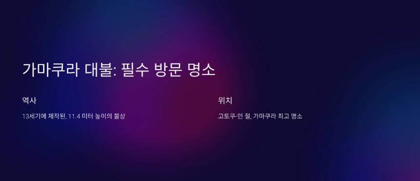 이 대불은 1252년에 처음 세워졌으며, 원래는 실내에 있었지만 쓰나미와 태풍으로 사찰이 파괴된 이후 지금의 야외 공간에 자리 잡게 되었어요. 이 때문에 자연과 조화를 이루는 대불의 모습은 더욱 인상적이에요.
