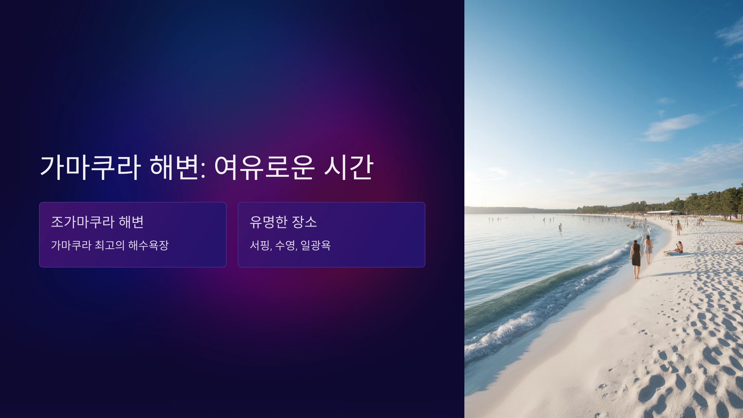서핑이나 카약 같은 액티비티를 즐길 수도 있어요. 가마쿠라의 해변은 단순히 경치를 감상하는 것뿐만 아니라, 다양한 활동을 경험할 수 있는 다채로운 공간이에요.