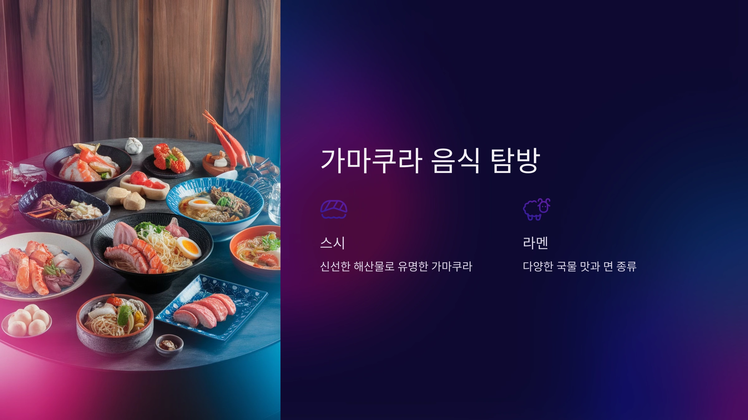 가마쿠라에서는 일본 전통 음식을 즐길 수 있는 다양한 맛집들이 있어요. 특히 현지의 신선한 해산물로 만든 요리는 꼭 맛봐야 할 음식 중 하나랍니다. '가마쿠라 쇼난 지역'의 명물인 생선 덮밥(카이센동)은 강력 추천 메뉴예요.