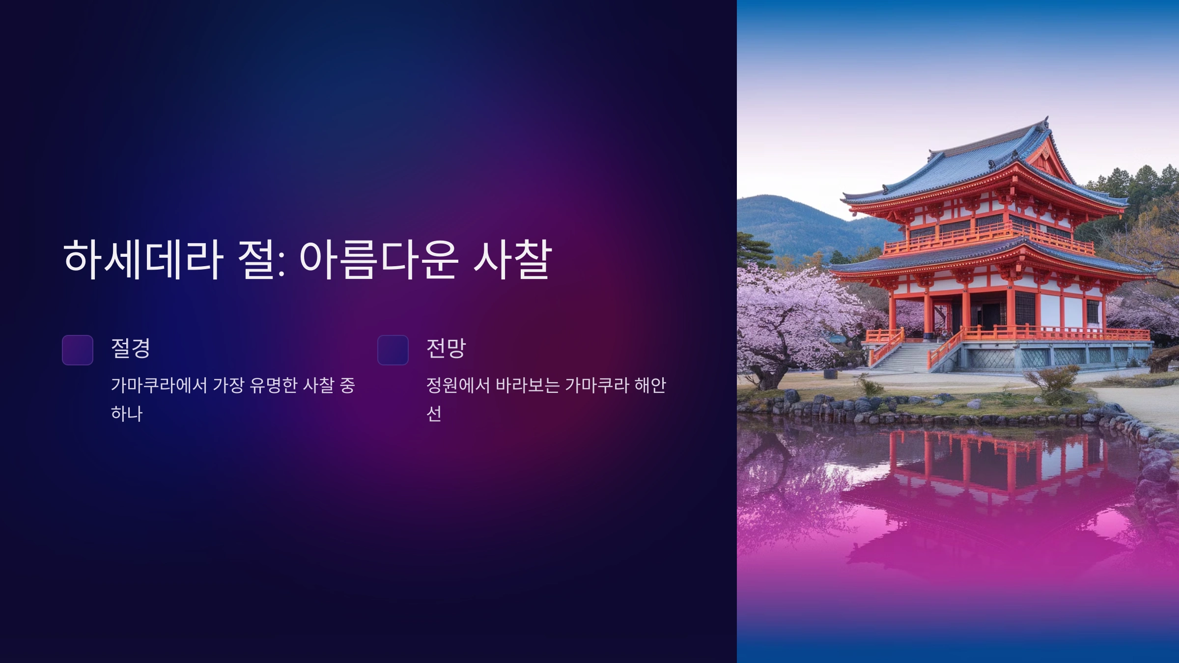 하세데라 절은 정원이 잘 꾸며져 있어요. 봄에는 벚꽃이 만개하고, 여름에는 수국이 절을 가득 메우며, 가을에는 단풍으로 물들어 방문객들에게 사계절의 변화를 느낄 수 있게 해줘요. 자연과 건축물이 조화를 이룬 이곳은 사진을 찍기에도 완벽한 장소랍니다.