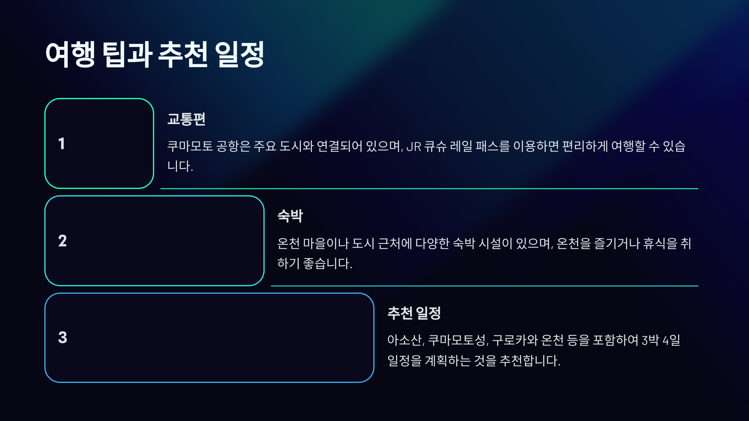 쿠마모토를 여행할 때, 가장 중요한 것은 이동 경로를 효율적으로 계획하는 거예요. 주요 관광지는 서로 멀리 떨어져 있는 경우가 많아, 렌터카를 이용하는 것이 편리해요.