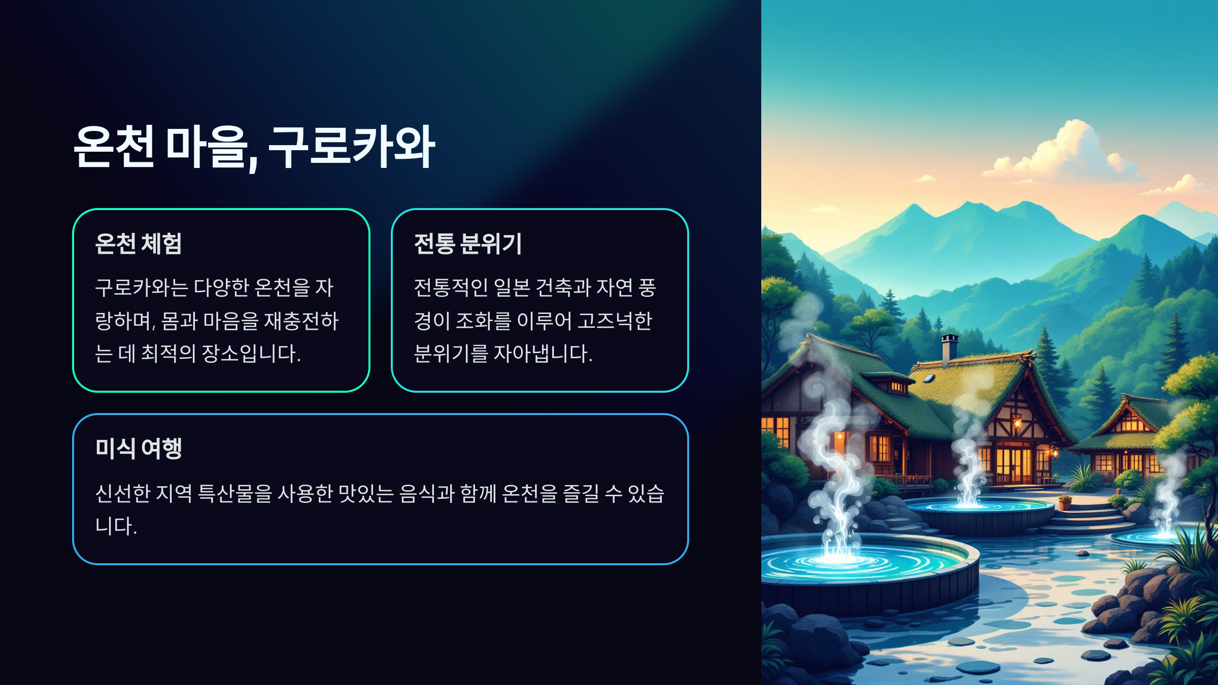 마을 곳곳에는 기념품 상점과 로컬 음식을 즐길 수 있는 작은 가게들이 있어서, 온천을 즐기며 산책하는 재미도 쏠쏠해요. 구로카와 온천은 몸과 마음 모두를 따뜻하게 만들어주는 여행지랍니다.