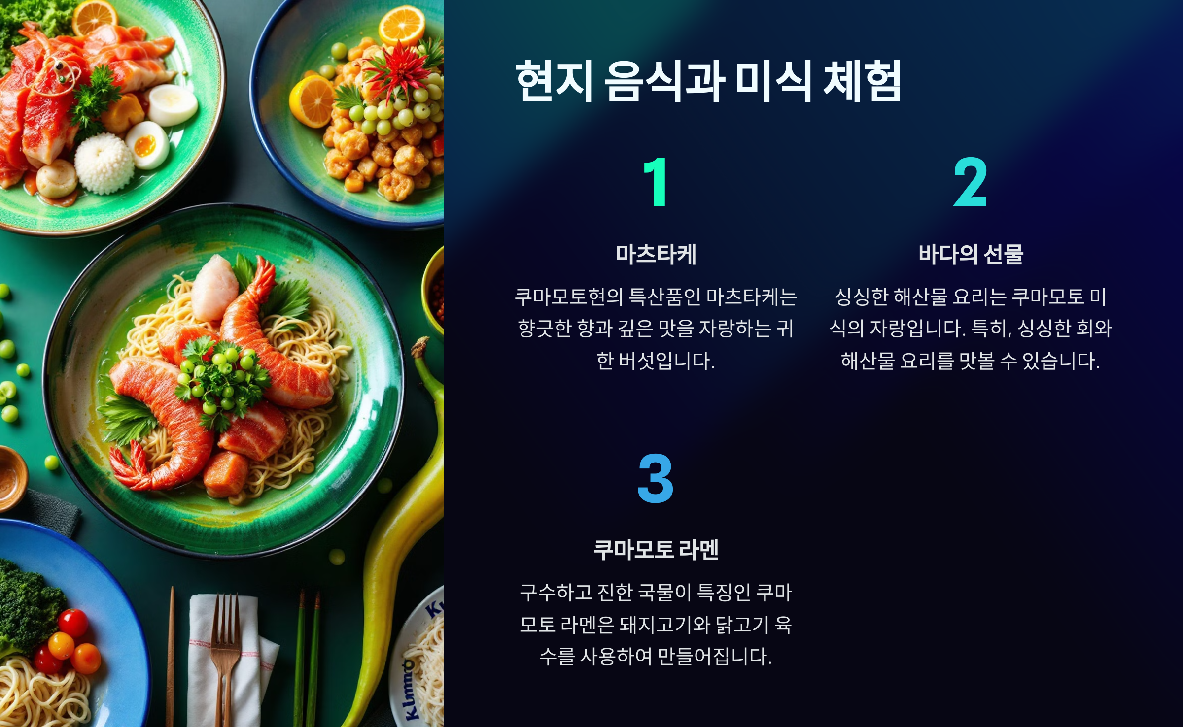 쿠마모토는 풍부한 자연 환경 덕분에 신선하고 맛있는 현지 음식이 가득한 곳이에요. 이곳에서는 꼭 시도해야 할 특별한 요리들이 많답니다.
