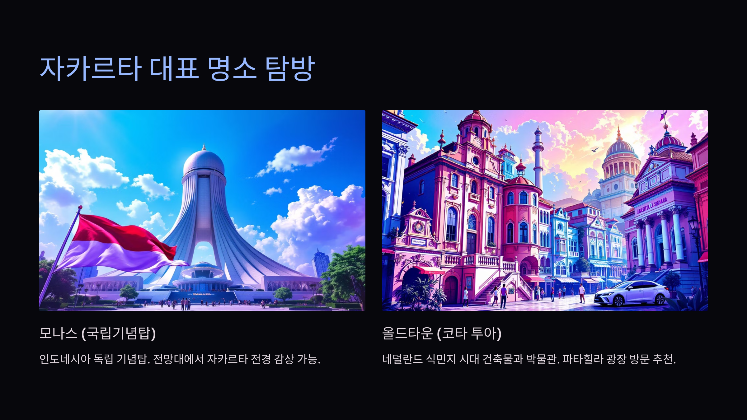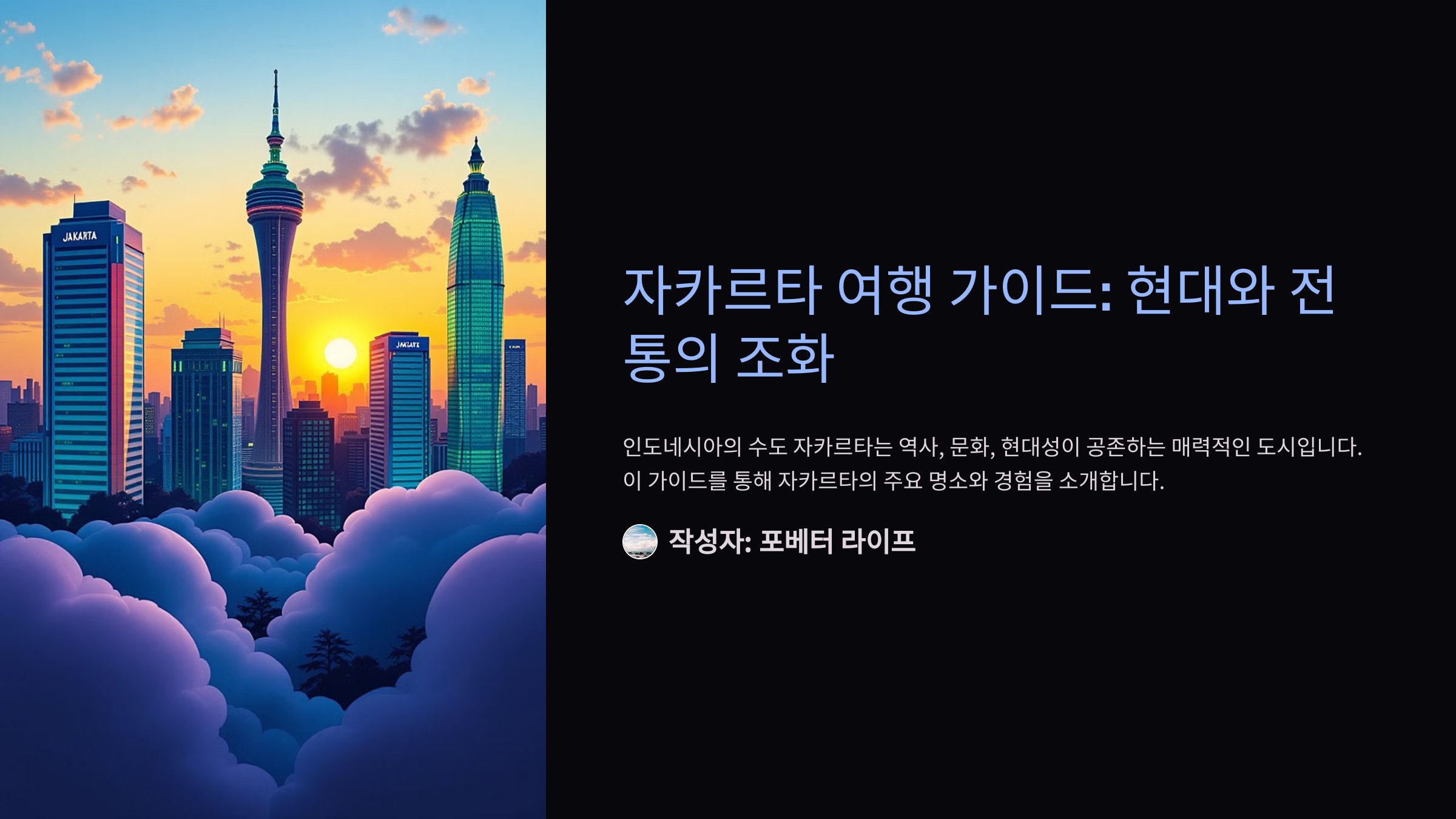 자카르타는 인도네시아의 수도이자 동남아시아의 대표적인 대도시로, 현대적인 도시의 매력과 함께 역사적인 유산이 조화를 이루는 곳입니다. 이곳에서는 화려한 고층 빌딩과 전통적인 시장, 다양한 문화가 어우러져 여행자들에게 독특한 경험을 제공합니다.