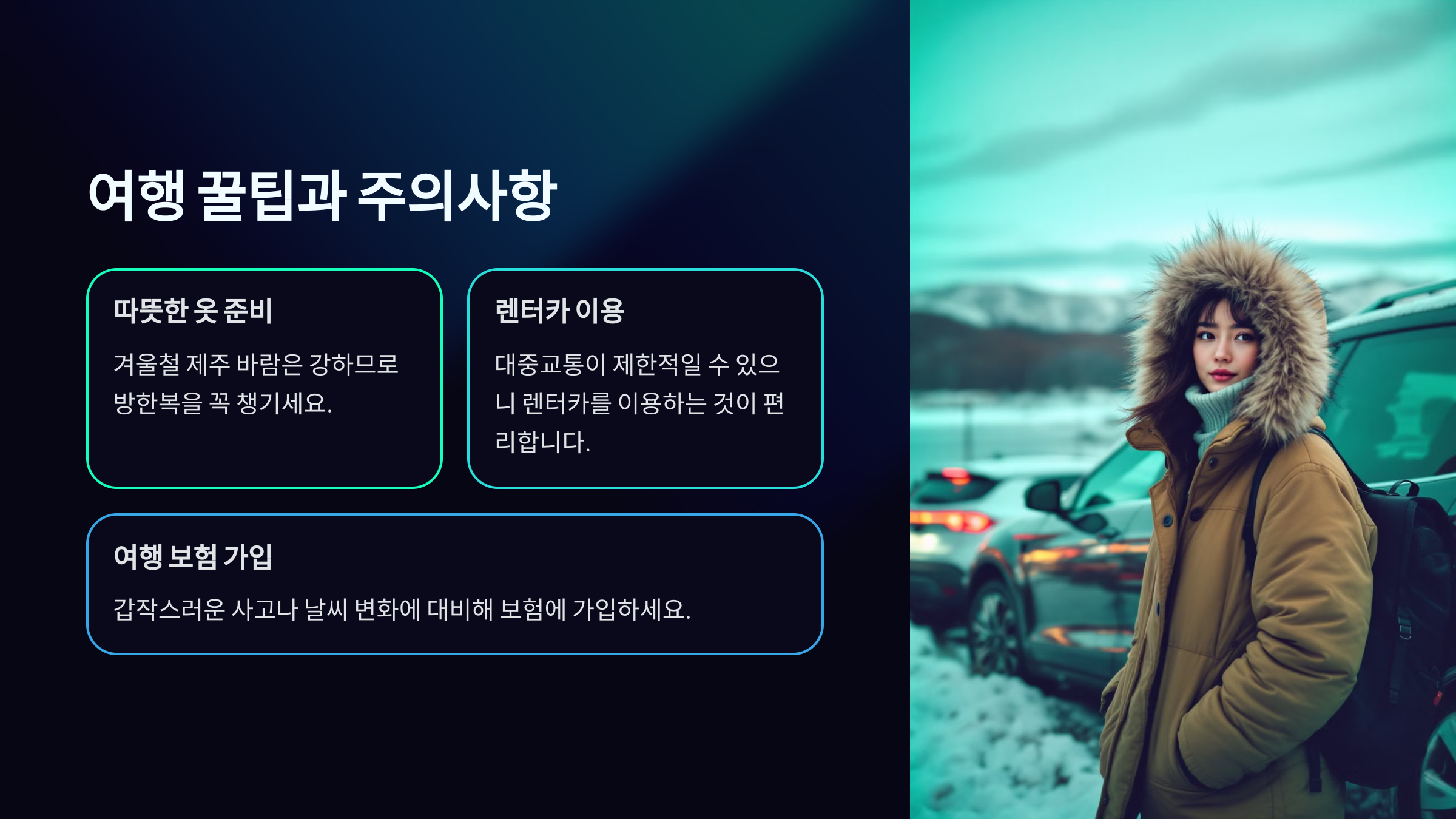 겨울철 제주 여행을 더욱 알차게 즐기기 위한 꿀팁과 주의사항을 알려드립니다.
