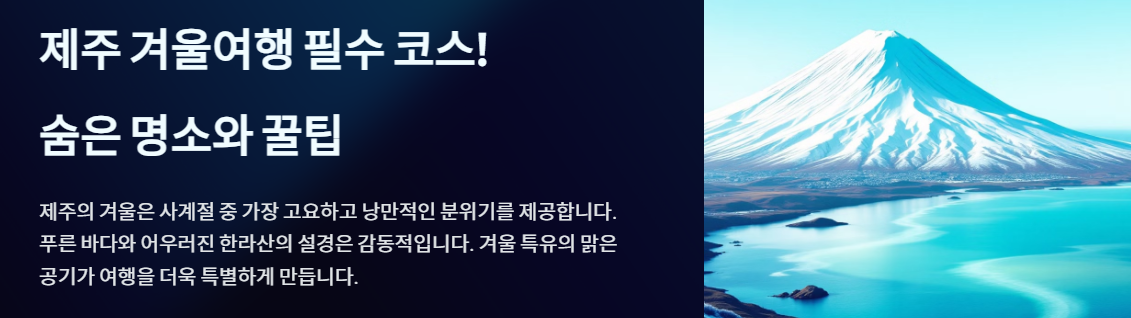제주의 겨울은 사계절 중 가장 고요하고 낭만적인 분위기를 제공합니다. 푸른 바다와 어우러진 한라산의 설경은 감동적이며, 겨울 특유의 맑은 공기가 여행을 더욱 특별하게 만듭니다.