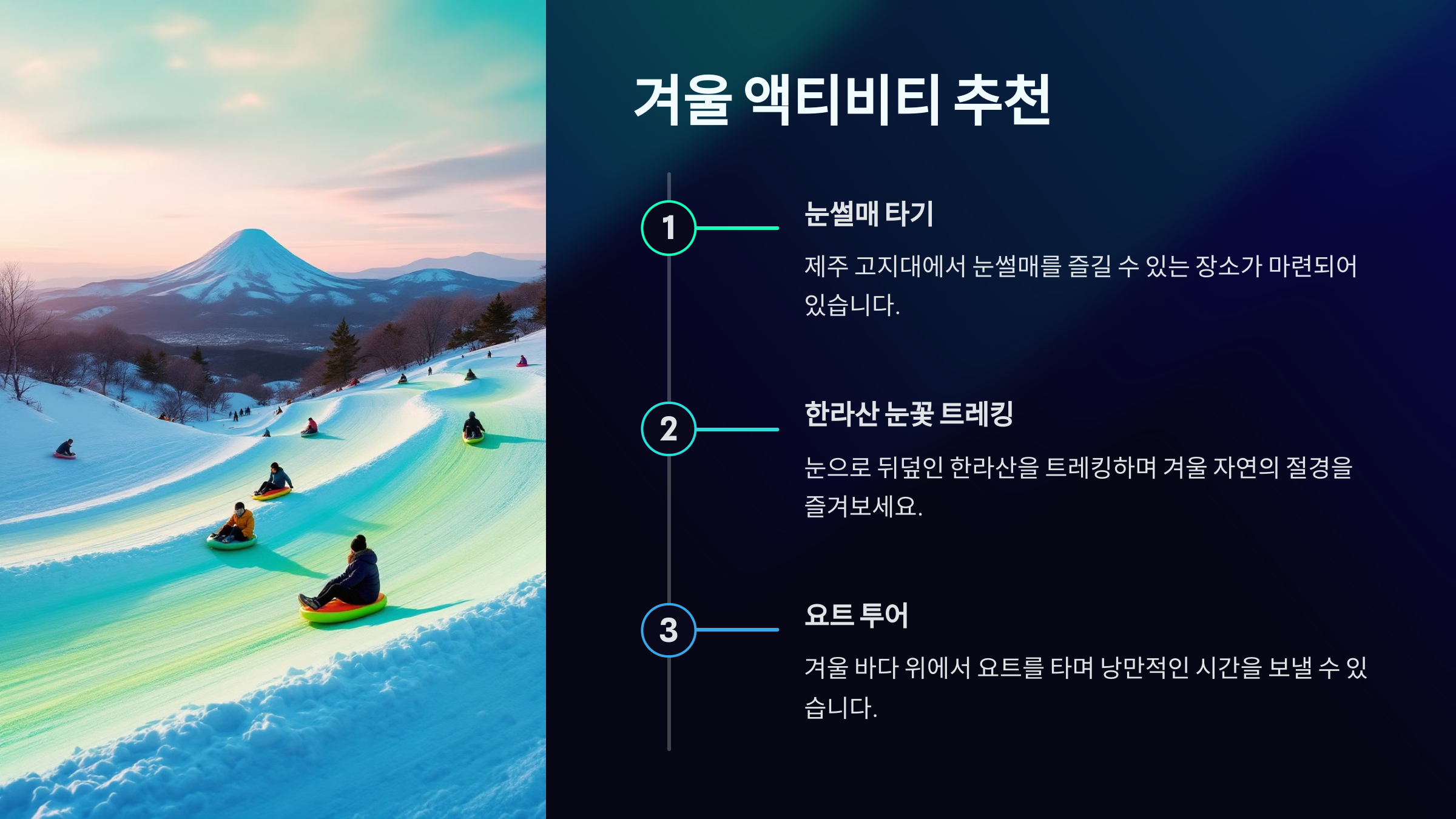 눈썰매 타기: 제주 고지대에서 눈썰매를 즐길 수 있는 장소가 마련되어 있습니다.