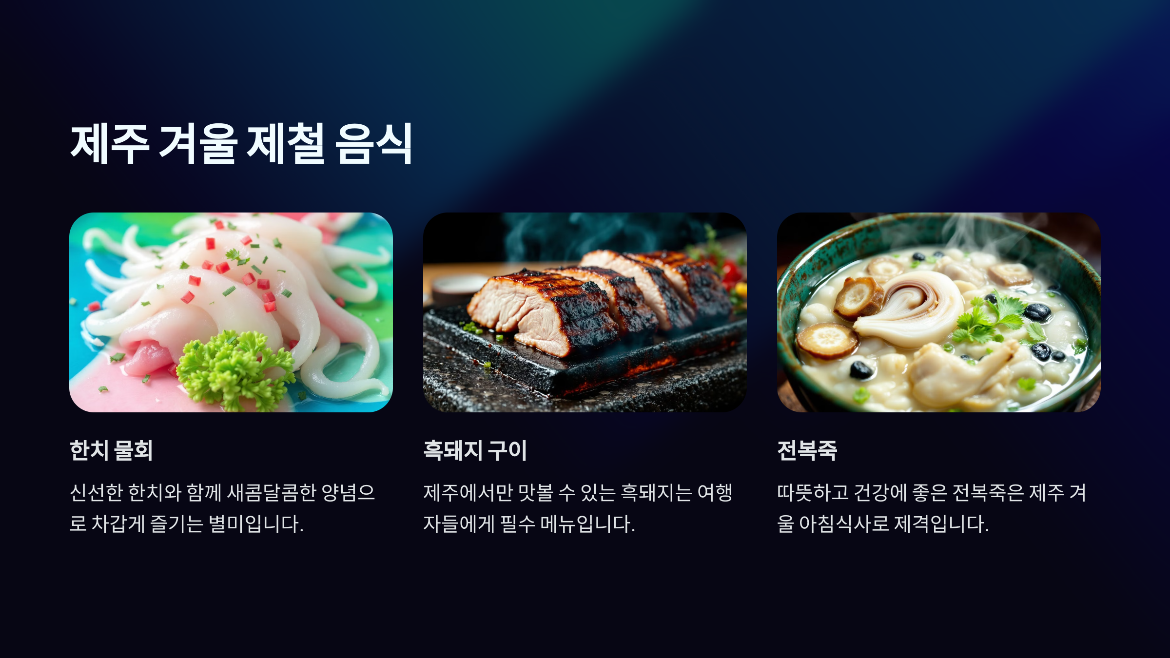 제주의 겨울은 다양한 제철 음식을 즐길 수 있는 계절입니다. 제주 현지에서 꼭 맛봐야 할 겨울 특산물을 소개합니다.