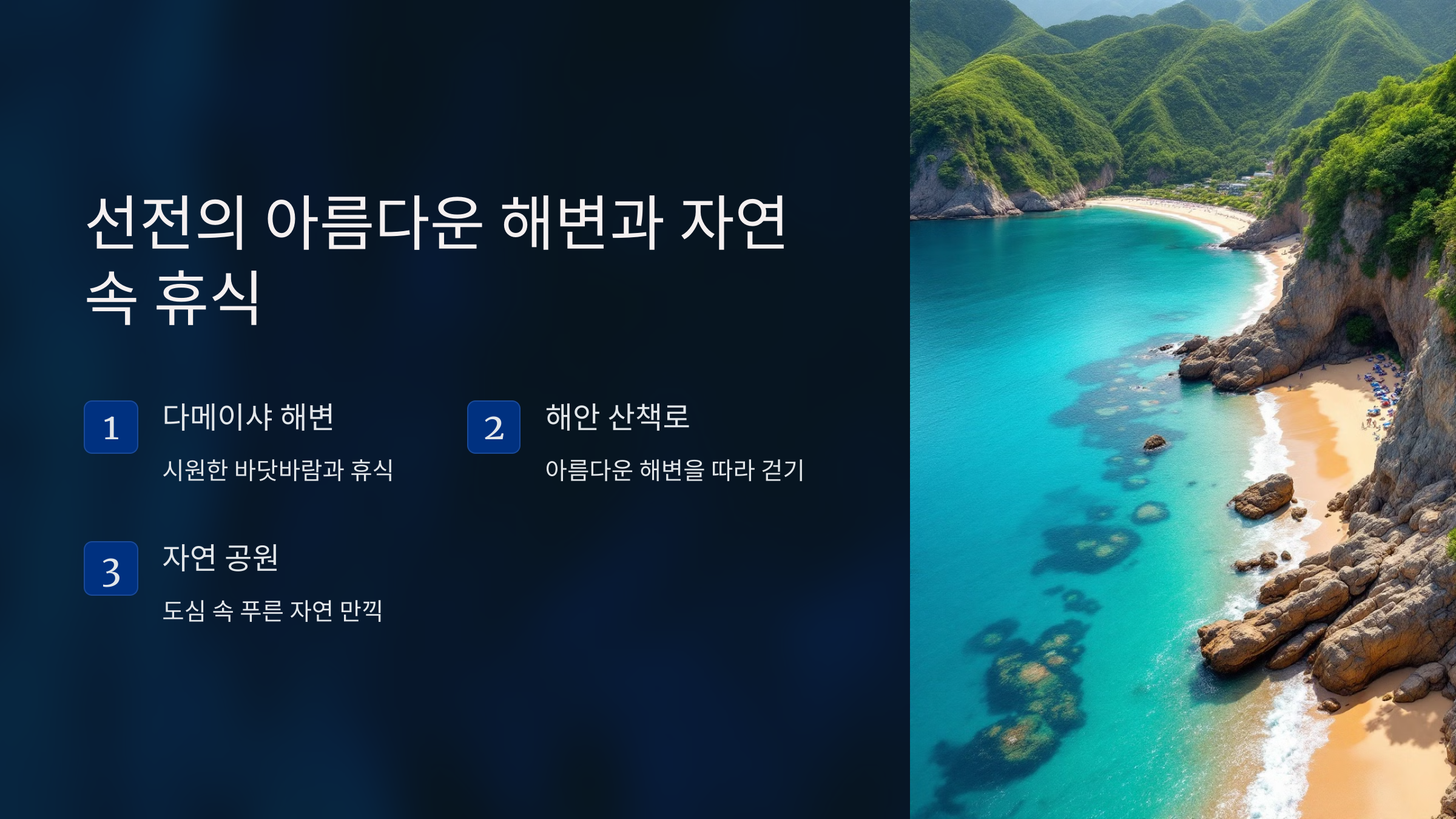 | 다메이샤 해변 | 넓고 깨끗한 모래사장 | 수상 스포츠 및 해수욕 |