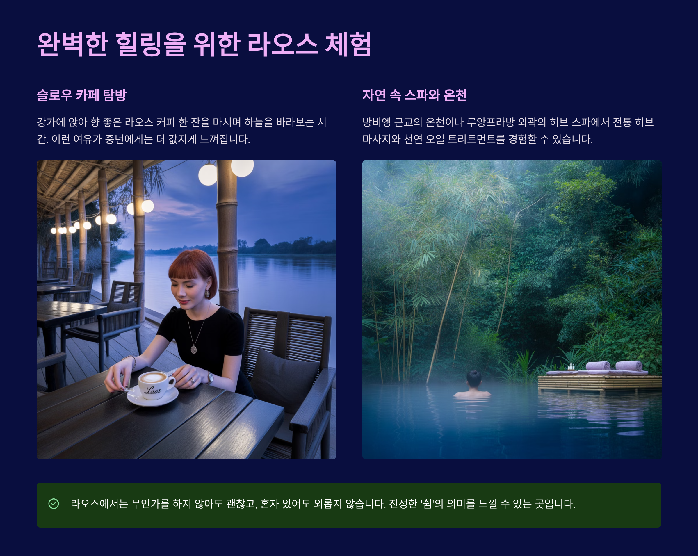 짧은 여행이라도 진짜로 나를 만나는 시간이 될 수 있는 곳이 라오스예요. 무언가를 하지 않아도 괜찮고, 혼자 있어도 외롭지 않은 그런 여행지. 특히 중년에게는 복잡한 도시보다 이런 여유가 훨씬 더 값지게 다가오죠.