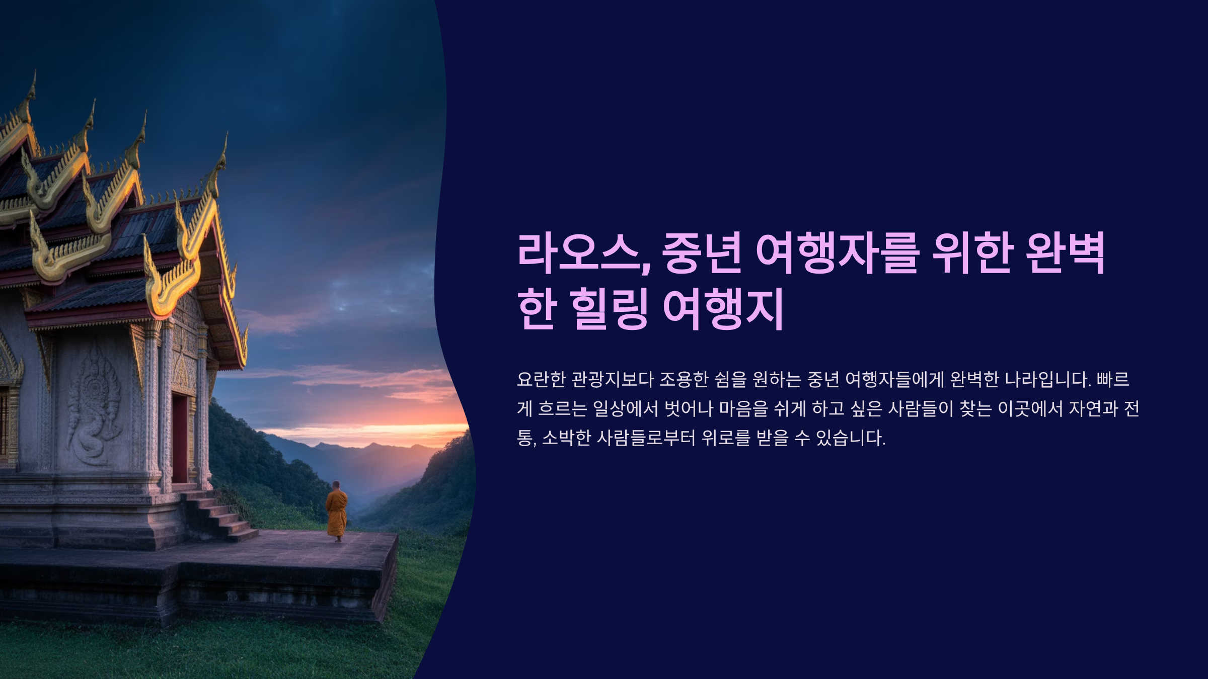 라오스는 요란한 관광지보다 조용한 쉼을 원하는 중년 여행자들에게 더할 나위 없이 완벽한 나라예요. 빠르게 흐르는 일상에서 벗어나 마음을 쉬게 하고 싶은 사람들이 찾는 이곳은, 자연과 전통, 그리고 소박한 사람들로부터 위로를 받을 수 있는 장소랍니다.