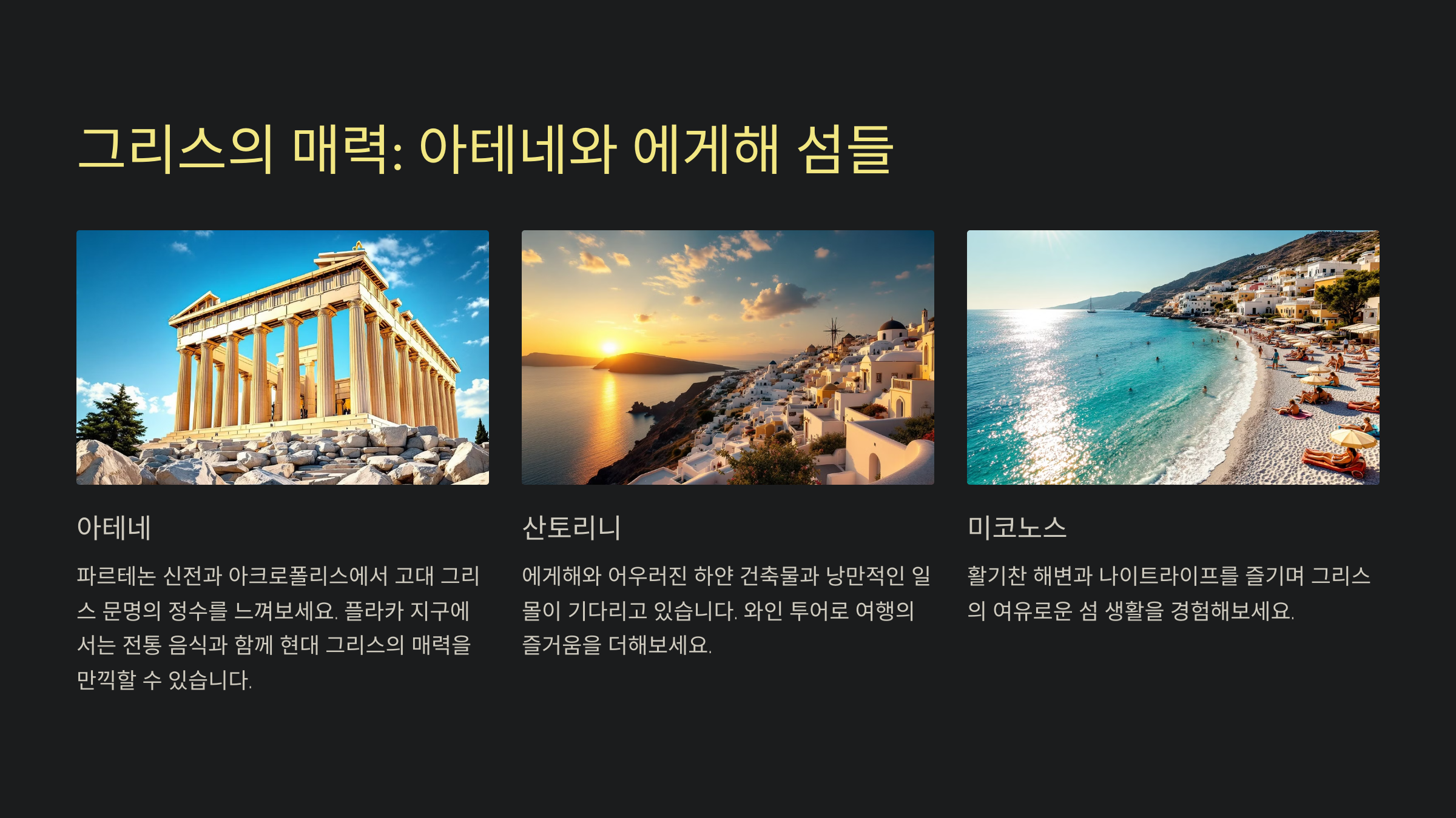 그리스 여행은 아테네에서 시작하는 것이 일반적입니다. 파르테논 신전과 아크로폴리스를 둘러보며 그리스 고대 문명의 중심을 느껴보세요. 플라카 지구에서 맛보는 그리스 전통 음식도 놓치지 마세요.