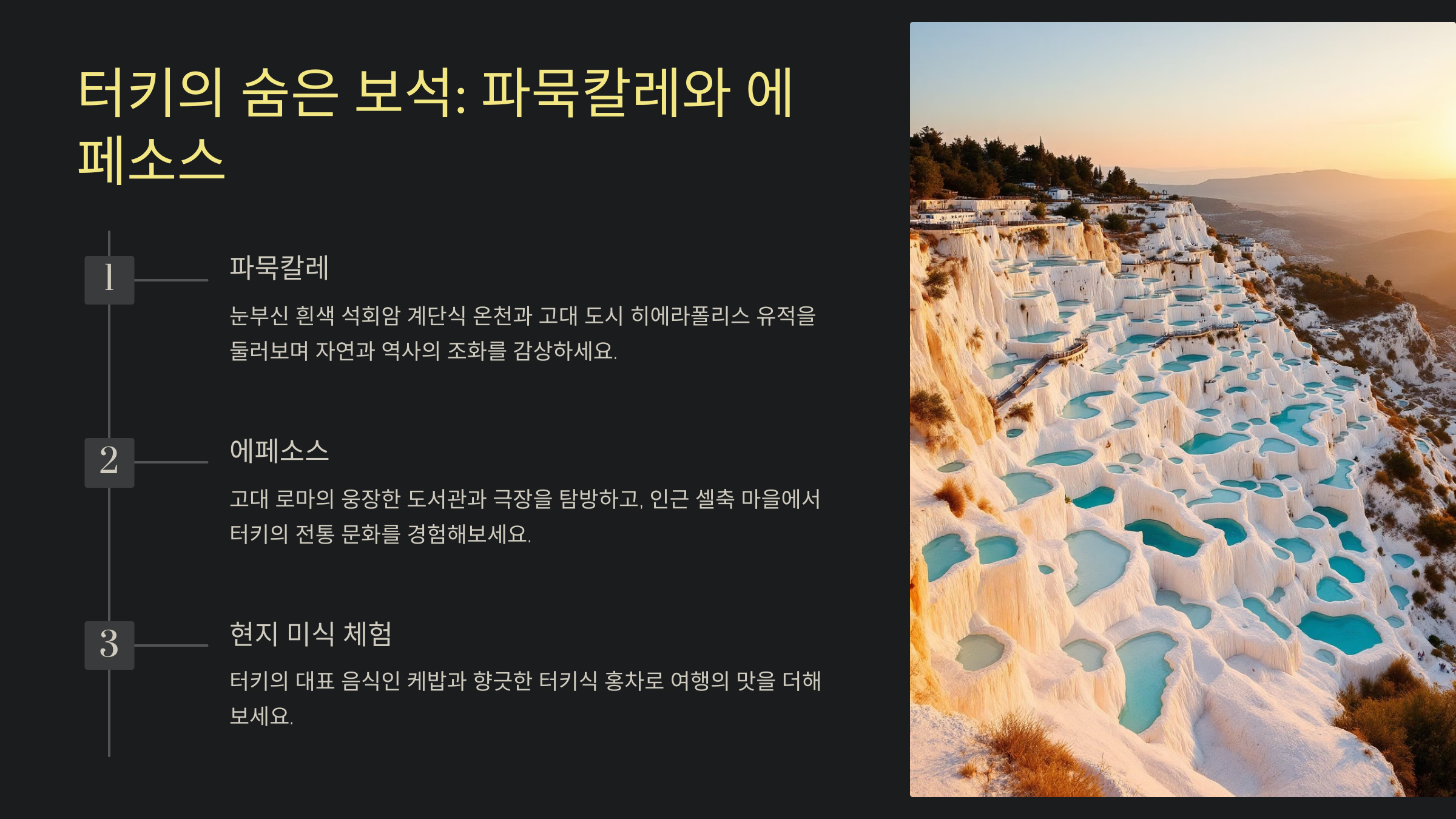 파묵칼레는 석회암 계단식 온천으로, 터키의 독특한 자연 경관 중 하나입니다. 인근의 히에라폴리스 유적지도 함께 방문해 고대 스파 도시의 흔적을 찾아보세요.