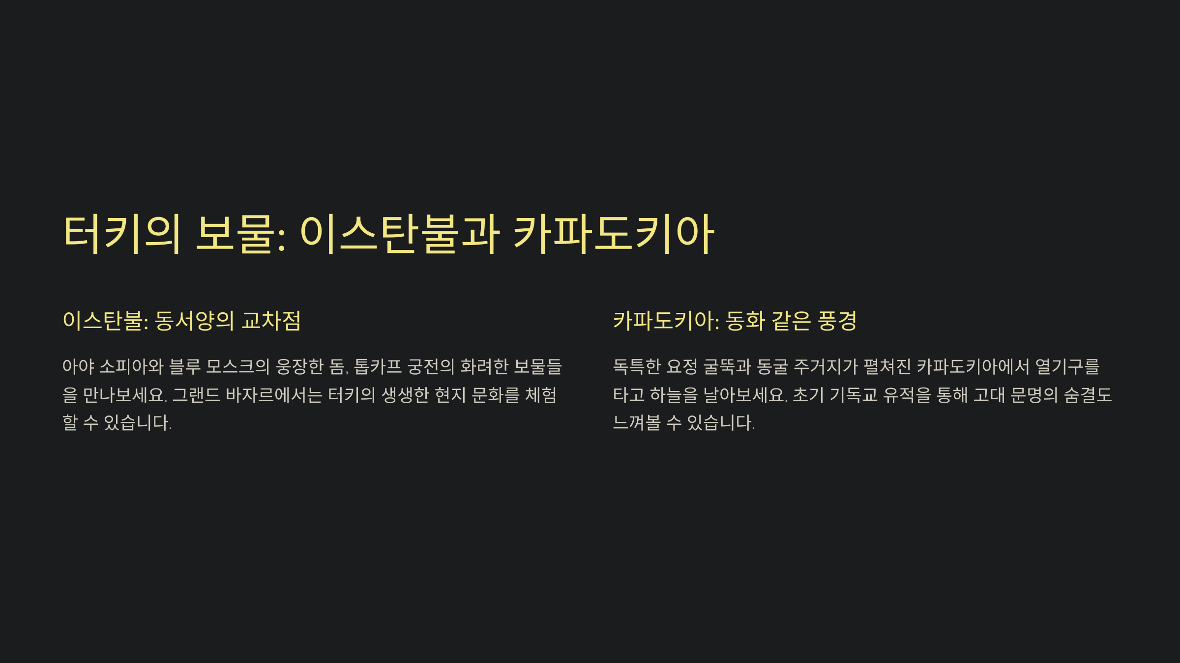 이스탄불은 터키 여행에서 빠질 수 없는 곳입니다. 아야 소피아와 블루 모스크는 화려한 건축미를 자랑하며, 톱카프 궁전에서는 오스만 제국의 위엄을 느낄 수 있습니다. 그랜드 바자르에서는 현지 문화를 느낄 수 있는 쇼핑 경험을 제공합니다.