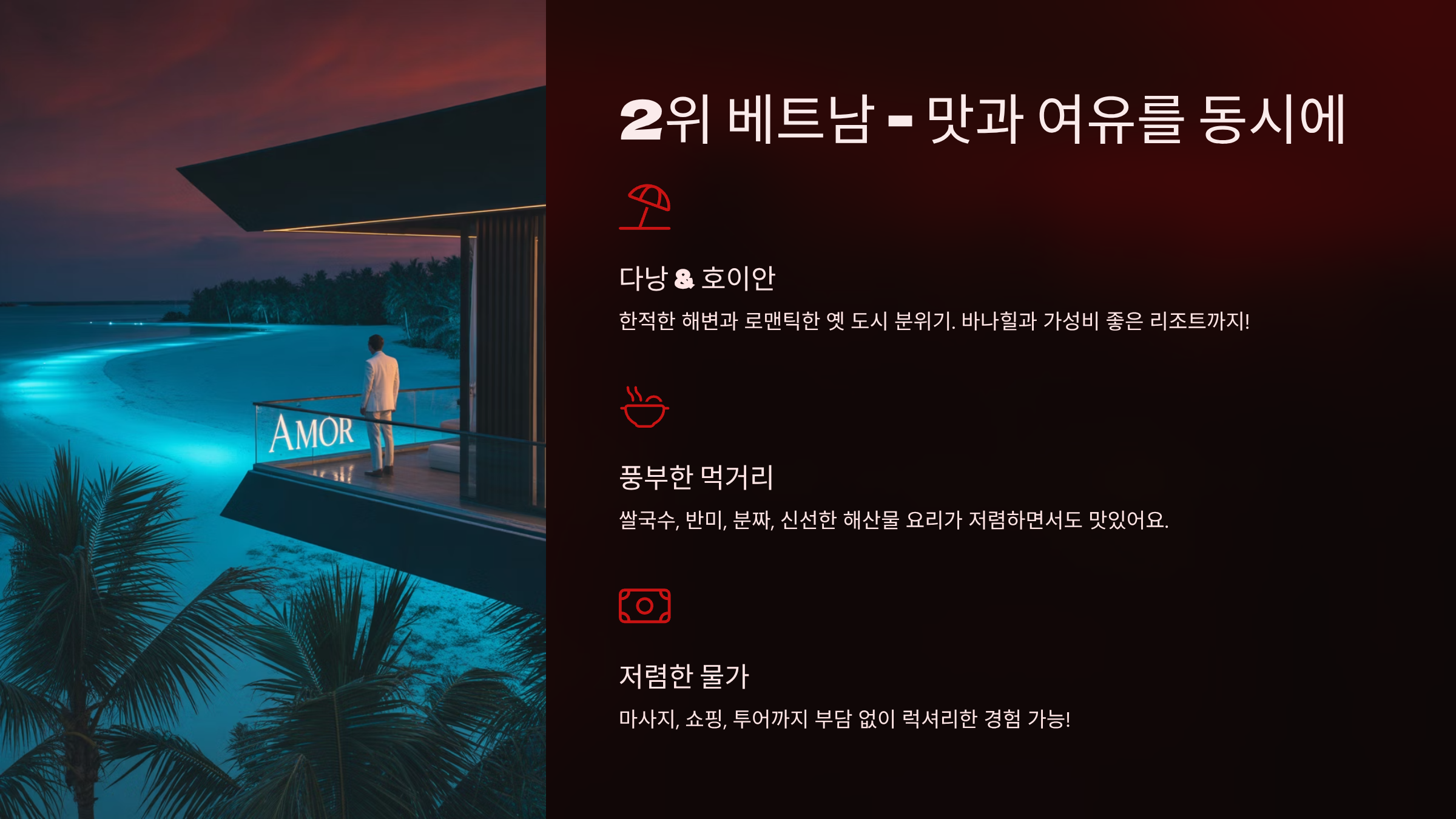 물가도 저렴해서 마사지, 쇼핑, 투어 등 부가적인 여행 즐길 거리까지 마음껏 누릴 수 있어요. 부담 없이 럭셔리한 경험을 하고 싶다면 베트남이 제격이에요!